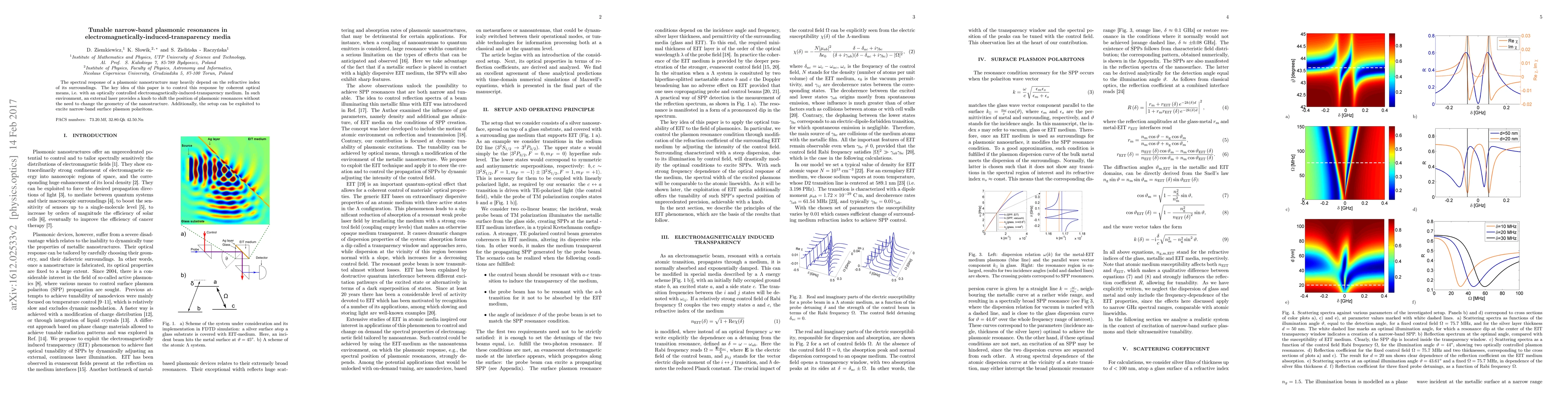 This paper explores how electromagnetically-induced-transparency media can be used to control plasmonic nanostructures' spectral response through coherent optical methods, allowing the tuning of narrow-band plasmonic resonances without altering the nanostructure's geometry. The setup enables the excitation of narrow-band surface plasmon polaritons.