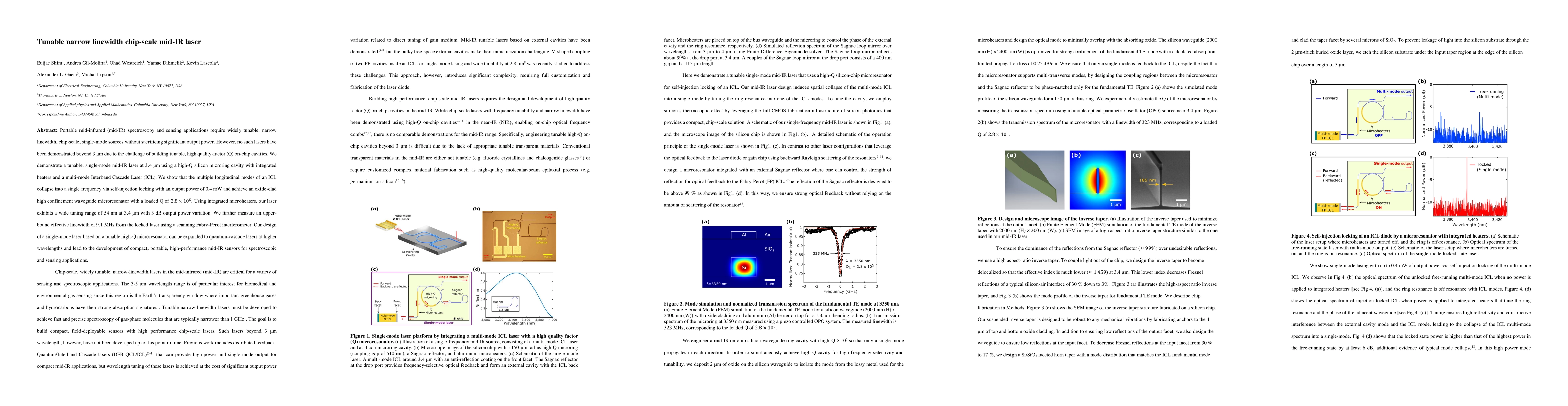 This paper demonstrates a tunable, narrow linewidth, single-mode mid-IR laser at 3.4 μm using a high-Q silicon microring cavity and a multi-mode Interband Cascade Laser. The laser exhibits an impressive tuning range and high output power, paving the way for compact, portable mid-IR spectroscopic and sensing devices.