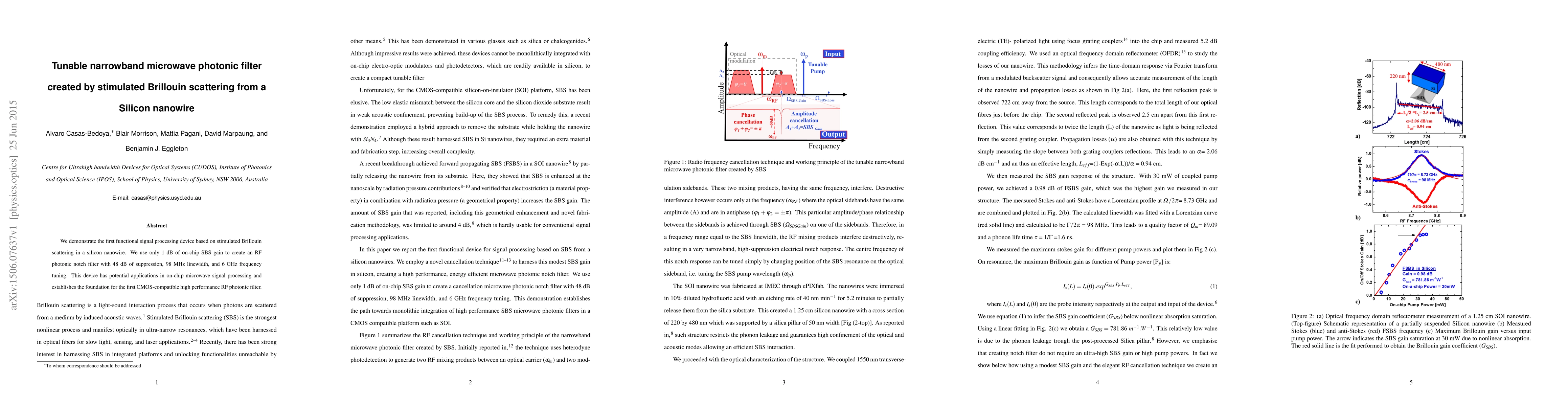 This paper presents a tunable narrowband microwave photonic filter based on stimulated Brillouin scattering in a silicon nanowire, achieving 48 dB suppression and 6 GHz frequency tuning with only 1 dB of on-chip gain. This CMOS-compatible device paves the way for advanced on-chip microwave signal processing.
