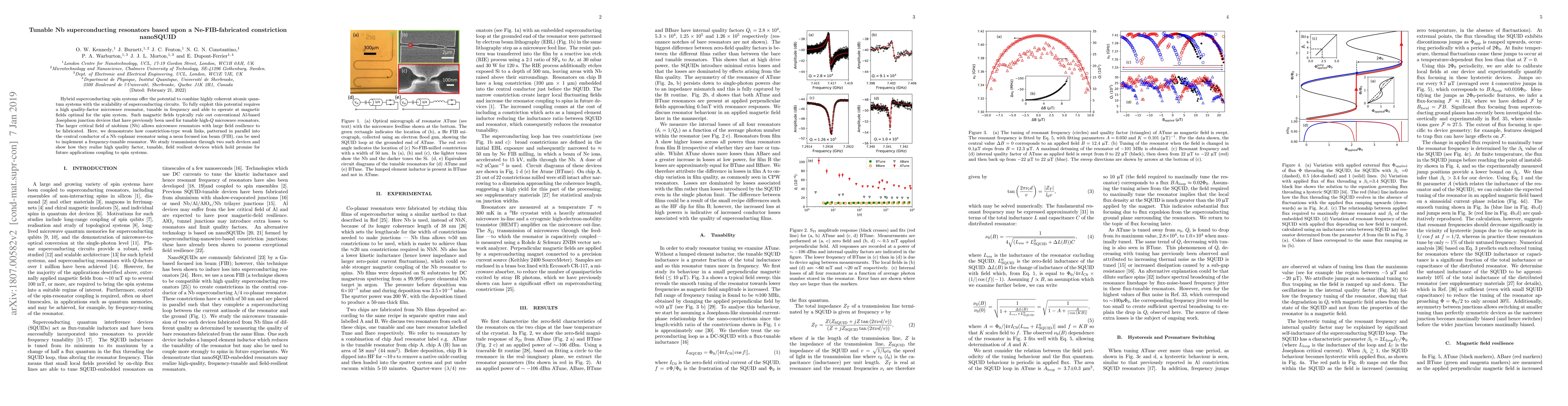 This paper demonstrates the fabrication of tunable Nb superconducting resonators using Ne-FIB-patterned constriction nanoSQUIDs, achieving high-quality factors and frequency tunability while maintaining resilience to magnetic fields. These devices show promise for future applications in coupling with hybrid superconducting-spin systems.