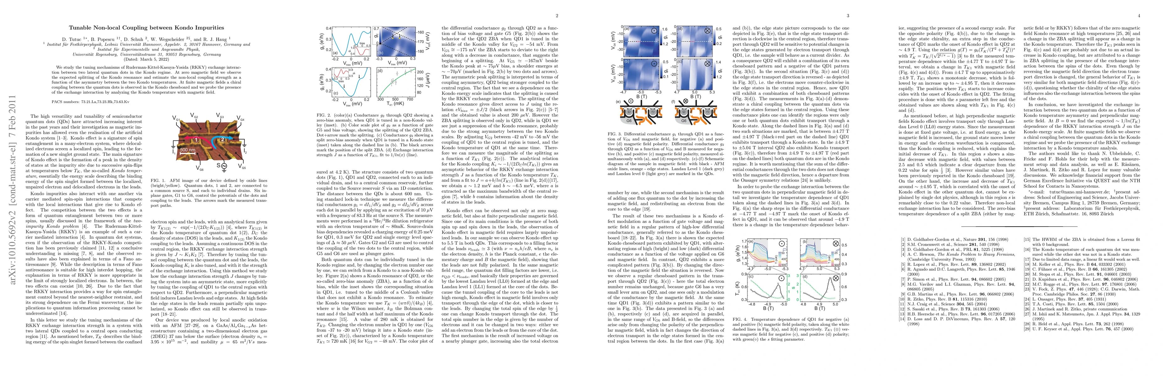 Researchers studied how the distance between two Kondo impurities affects their interaction, finding that the interaction can be tuned and observed even in the presence of a magnetic field.
