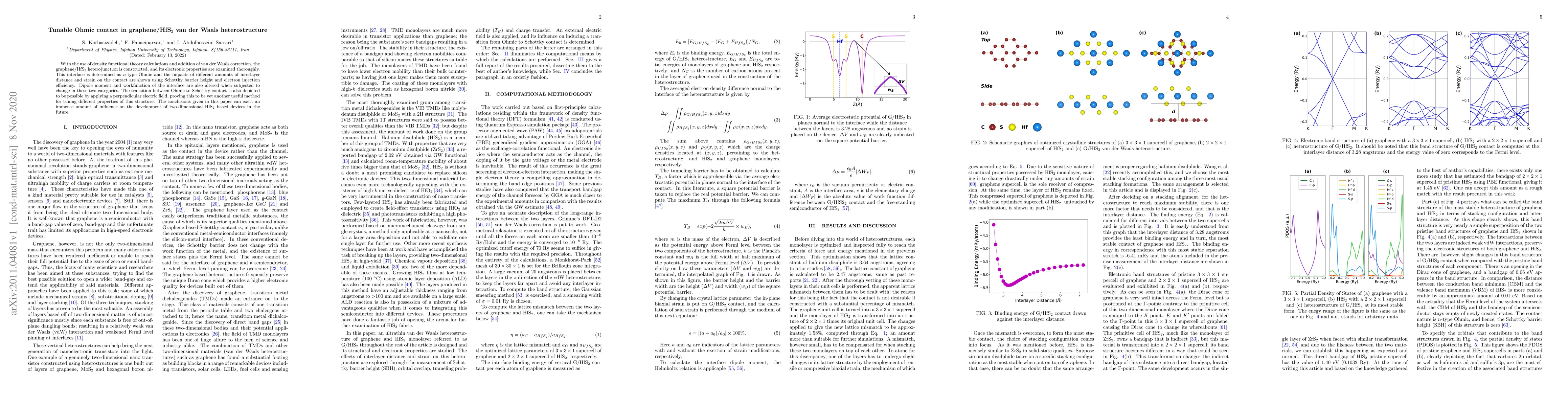 With the use of density functional theory calculations and addition of van der Waals correction, the graphene/HfS$_2$ heterojunction is constructed, and its electronic properties are examined thoroughly. This interface is determined as $n$-type Ohmic and the impacts of different amounts of interlayer distance and strain on the contact are shown using Schottky barrier height and electron injection efficiency. Dipole moment and workfunction of the interface are also altered when subjected to change in these two categories. The transition between Ohmic to Schottky contact is also depicted to be possible by applying a perpendicular electric field, proving this to be yet another useful method for tuning different properties of this structure. The conclusions given in this paper can exert an immense amount of influence on the development of two-dimensional HfS$_2$ based devices in the future.