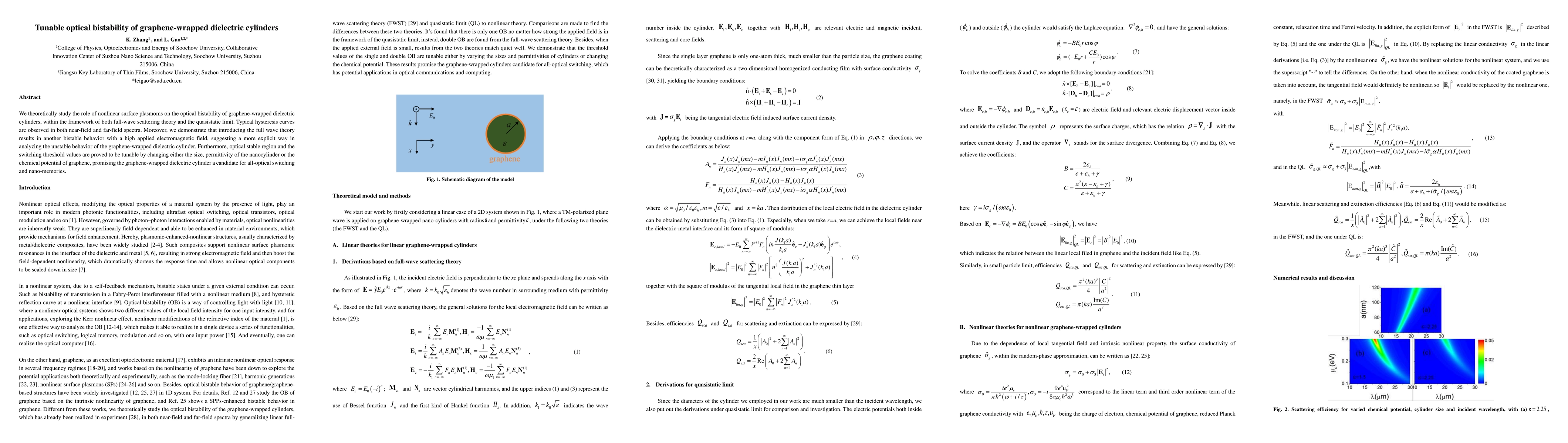 This research explores the tunable optical bistability in graphene-wrapped dielectric cylinders, demonstrating hysteresis curves using full-wave scattering theory and quasistatic limits. The study shows tunable optical stable regions and switching thresholds by altering nanocylinder size, permittivity, or graphene's chemical potential, indicating potential for all-optical switching and nano-memories.