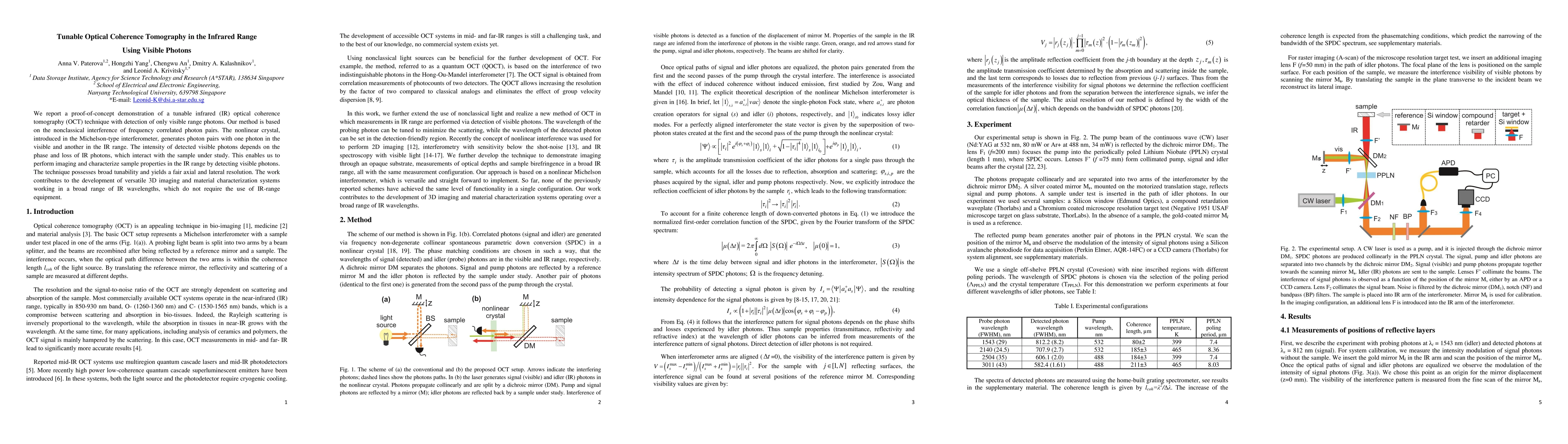 This paper demonstrates a tunable infrared optical coherence tomography technique using visible photons, based on the interference of frequency-correlated photon pairs. The method enables 3D imaging and material characterization in the IR range without requiring IR-specific equipment, offering broad tunability and good resolution.