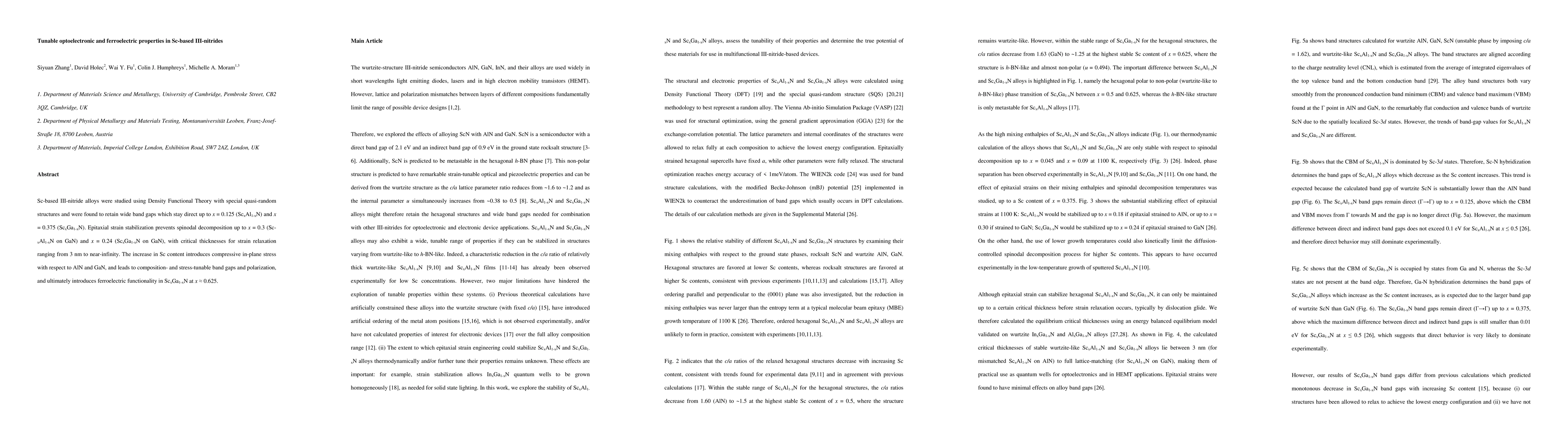 This study reveals that Sc-based III-nitride alloys exhibit tunable optoelectronic and ferroelectric properties due to tunable band gaps and polarization, with ScxGa1-xN showing ferroelectric functionality at high Sc content. Density Functional Theory predicts that epitaxial strain stabilizes these alloys, preventing decomposition up to specific Sc concentrations.