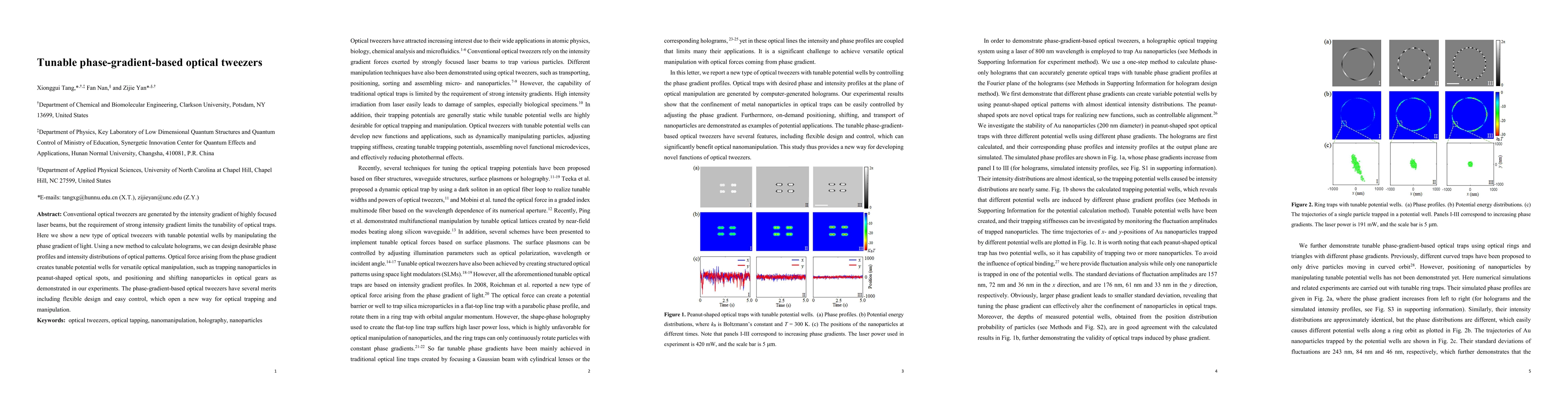 This paper introduces tunable phase-gradient-based optical tweezers, which manipulate phase gradients instead of intensity gradients to create versatile optical traps. The method allows for flexible design and control, enabling applications like trapping nanoparticles in unique shapes and positioning them in optical gears.