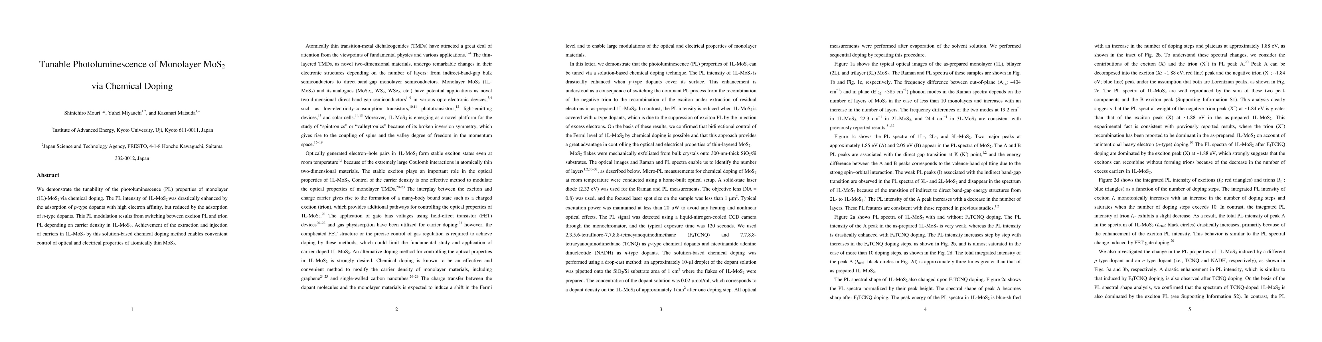 This paper demonstrates how chemical doping can tune the photoluminescence of monolayer MoS2, showing enhanced PL with p-type dopants and reduced PL with n-type dopants, due to changes from exciton to trion PL. This method allows for the control of both optical and electrical properties of monolayer MoS2.