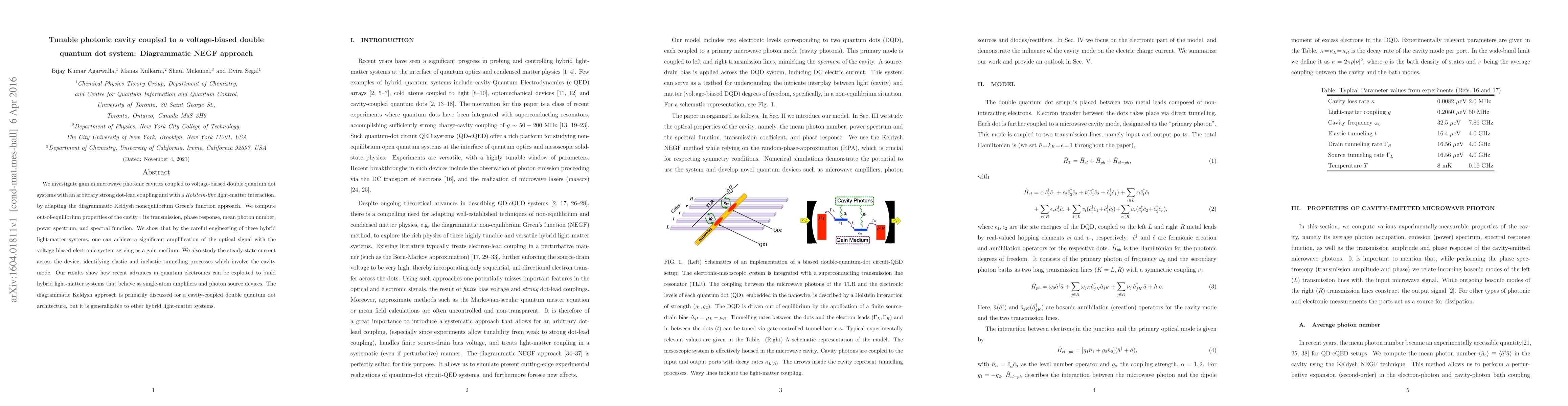 This paper explores the gain in microwave photonic cavities linked to voltage-biased double quantum dot systems using a diagrammatic Keldysh nonequilibrium Green's function approach. It demonstrates significant optical signal amplification and identifies elastic and inelastic tunneling processes, showcasing the potential for building single-atom amplifiers and photon source devices.