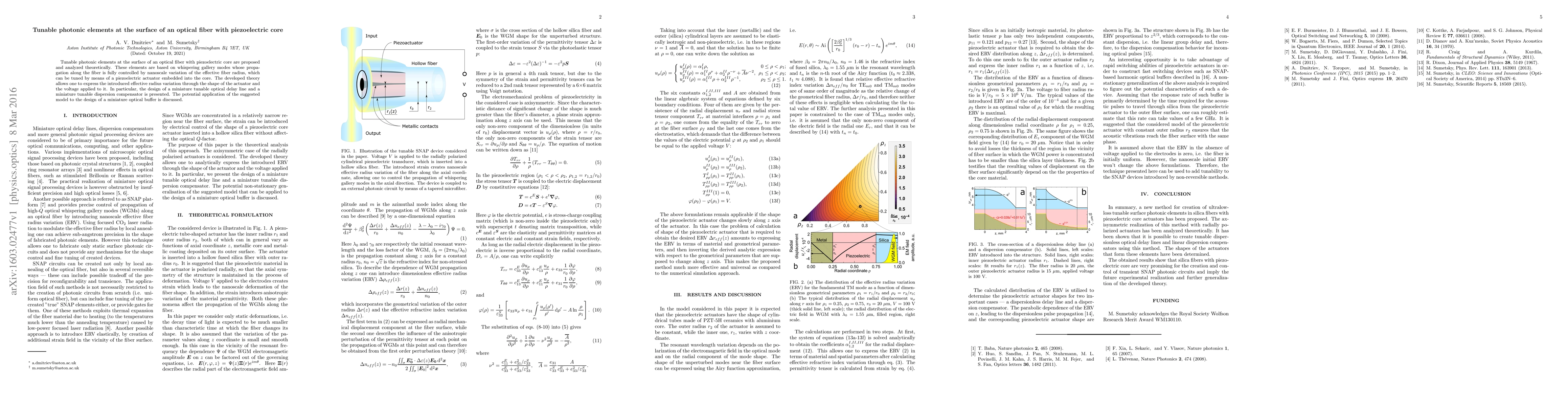 Tunable photonic elements at the surface of an optical fiber with piezoelectric core are proposed and analyzed theoretically. These elements are based on whispering gallery modes whose propagation along the fiber is fully controlled by nanoscale variation of the effective fiber radius, which can be tuned by means of a piezoelectric actuator embedded into the core. The developed theory allows one to express the introduced effective radius variation through the shape of the actuator and the voltage applied to it. In particular, the design of a miniature tunable optical delay line and a miniature tunable dispersion compensator is presented. The potential application of the suggested model to the design of a miniature optical buffer is discussed.