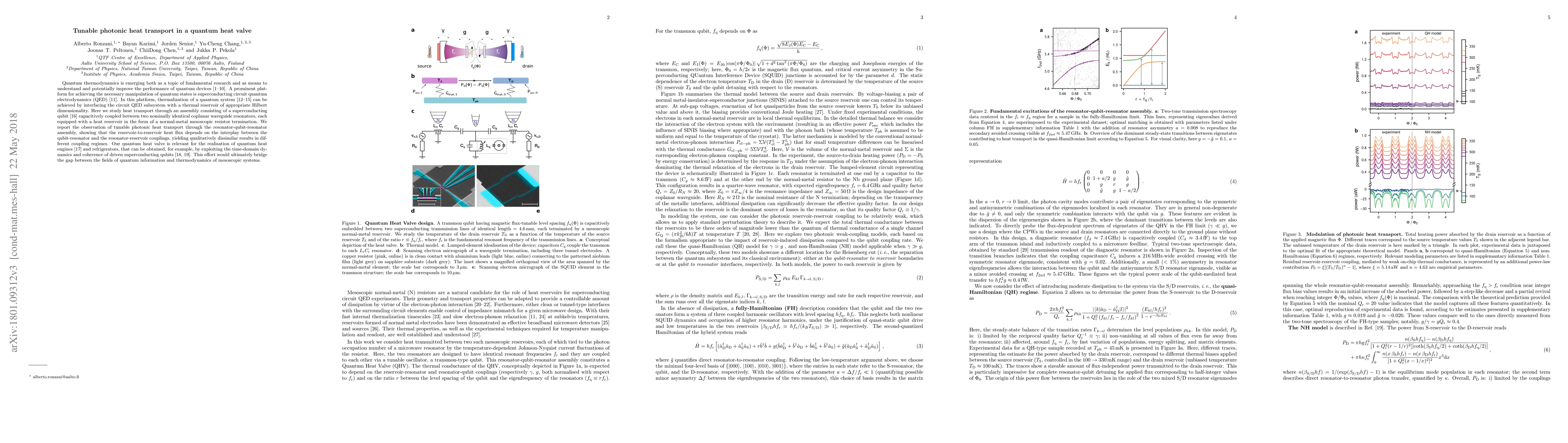 Quantum thermodynamics is emerging both as a topic of fundamental research and as means to understand and potentially improve the performance of quantum devices. A prominent platform for achieving the necessary manipulation of quantum states is superconducting circuit quantum electrodynamics (QED). In this platform, thermalization of a quantum system can be achieved by interfacing the circuit QED subsystem with a thermal reservoir of appropriate Hilbert dimensionality. Here we study heat transport through an assembly consisting of a superconducting qubit capacitively coupled between two nominally identical coplanar waveguide resonators, each equipped with a heat reservoir in the form of a normal-metal mesoscopic resistor termination. We report the observation of tunable photonic heat transport through the resonator-qubit-resonator assembly, showing that the reservoir-to-reservoir heat flux depends on the interplay between the qubit-resonator and the resonator-reservoir couplings, yielding qualitatively dissimilar results in different coupling regimes. Our quantum heat valve is relevant for the realisation of quantum heat engines and refrigerators, that can be obtained, for example, by exploiting the time-domain dynamics and coherence of driven superconducting qubits. This effort would ultimately bridge the gap between the fields of quantum information and thermodynamics of mesoscopic systems.