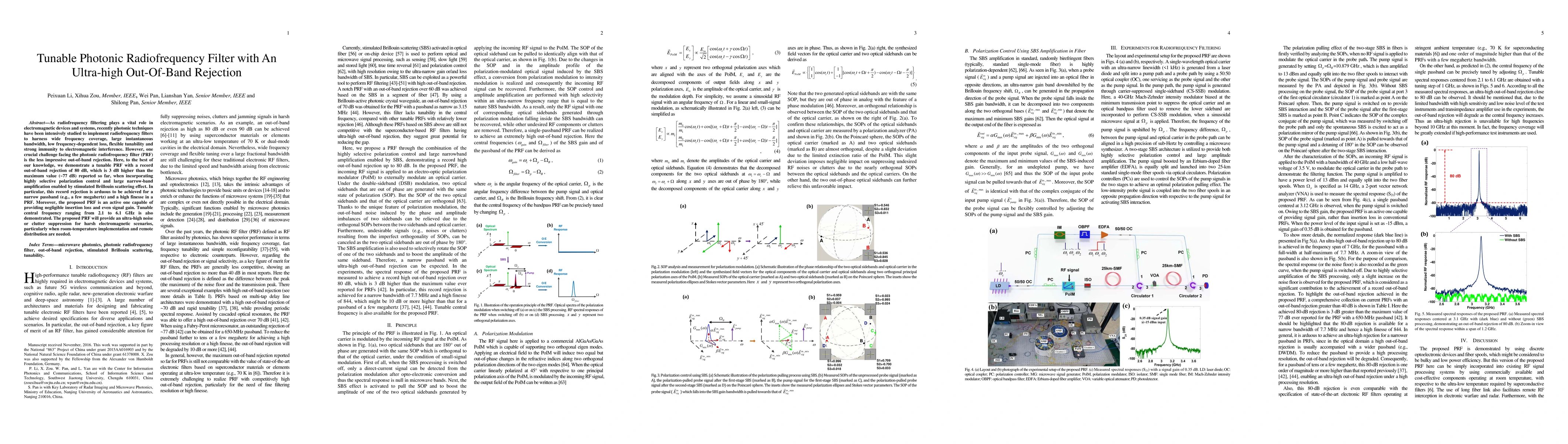 This paper presents a tunable photonic radiofrequency filter (PRF) with an unprecedented out-of-band rejection of 80 dB, achieved through polarization control and stimulated Brillouin scattering, enabling high performance in electromagnetic interference scenarios. The filter also offers tunable central frequency and negligible insertion loss.
