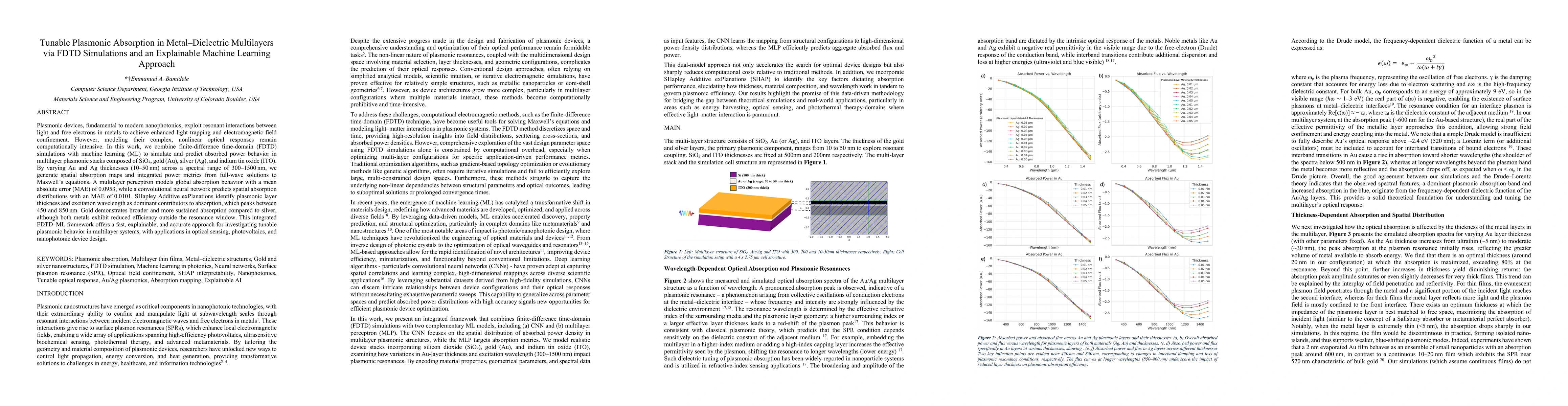 Plasmonic devices, fundamental to modern nanophotonics, exploit resonant interactions between light and free electrons in metals to achieve enhanced light trapping and electromagnetic field confinement. However, modeling their complex, nonlinear optical responses remains computationally intensive. In this work, we combine finite-difference time-domain simulations with machine learning to simulate and predict absorbed power behavior in multilayer plasmonic stacks composed of SiO2, gold, silver, and indium tin oxide. By varying Au and Ag thicknesses (10-50nm) across a spectral range of 300-1500nm, we generate spatial absorption maps and integrated power metrics from full-wave solutions to Maxwell's equations. A multilayer perceptron models global absorption behavior with a mean absolute error of 0.0953, while a convolutional neural network predicts spatial absorption distributions with an MAE of 0.0101. SHapley Additive exPlanations identify plasmonic layer thickness and excitation wavelength as dominant contributors to absorption, which peaks between 450 and 850~nm. Gold demonstrates broader and more sustained absorption compared to silver, although both metals exhibit reduced efficiency outside the resonance window. This integrated FDTD-ML framework offers a fast, explainable, and accurate approach for investigating tunable plasmonic behavior in multilayer systems, with applications in optical sensing, photovoltaics, and nanophotonic device design.