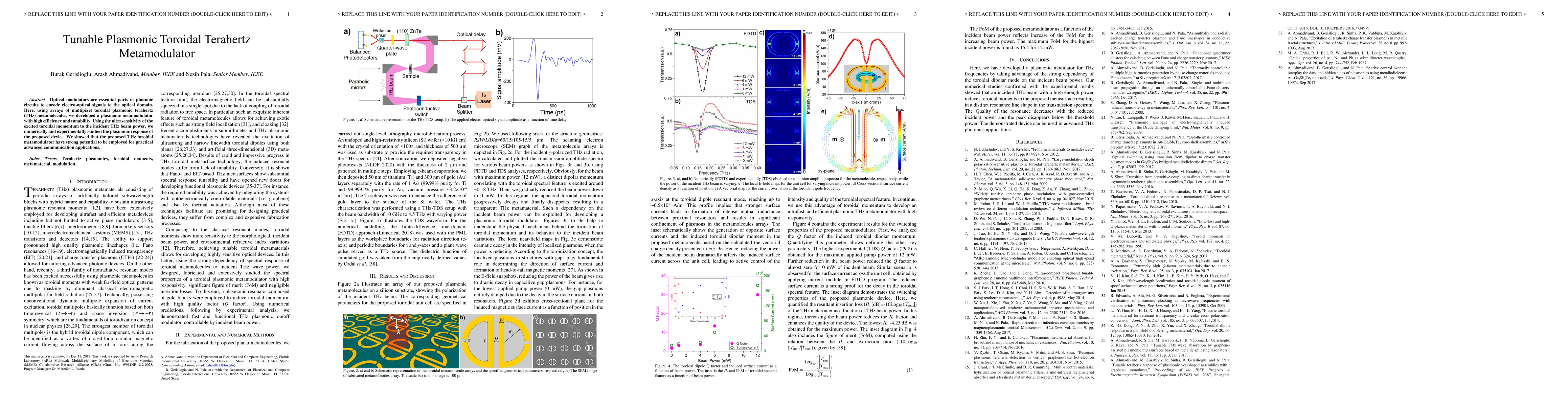 This paper presents a high-efficiency and tunable plasmonic toroidal metamodulator based on multipixel toroidal plasmonic terahertz metamolecules. The device's ultrasensitivity to incident THz beam power demonstrates its potential for advanced communication applications.