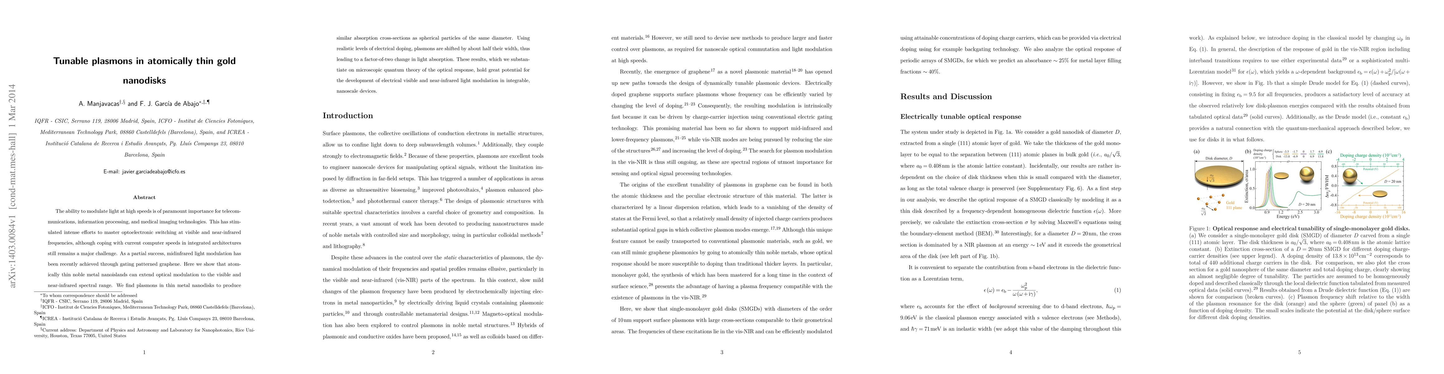 This paper demonstrates that atomically thin gold nanodisks can modulate light in the visible and near-infrared range through tunable plasmons. Electrical doping shifts plasmons by half their width, enabling significant changes in light absorption, which holds promise for nanoscale optoelectronic devices.