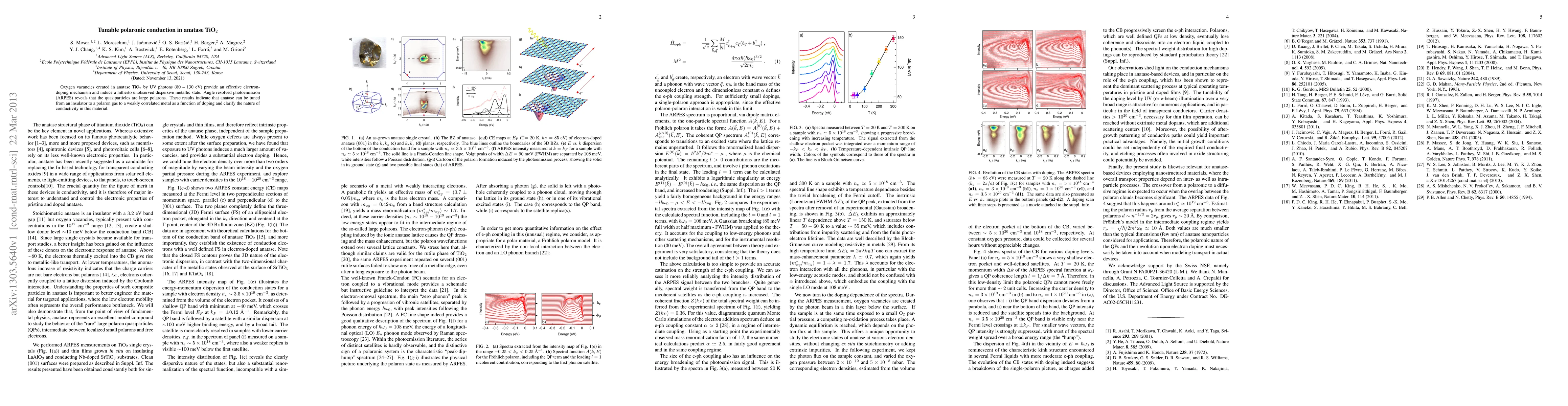 Summary: UV photons create oxygen vacancies in anatase TiO2, leading to a tunable metallic state via large polaron quasiparticles, transforming the material from an insulator to a weakly correlated metal. ARPES confirms the presence of these polarons, elucidating the material's conductivity mechanisms.