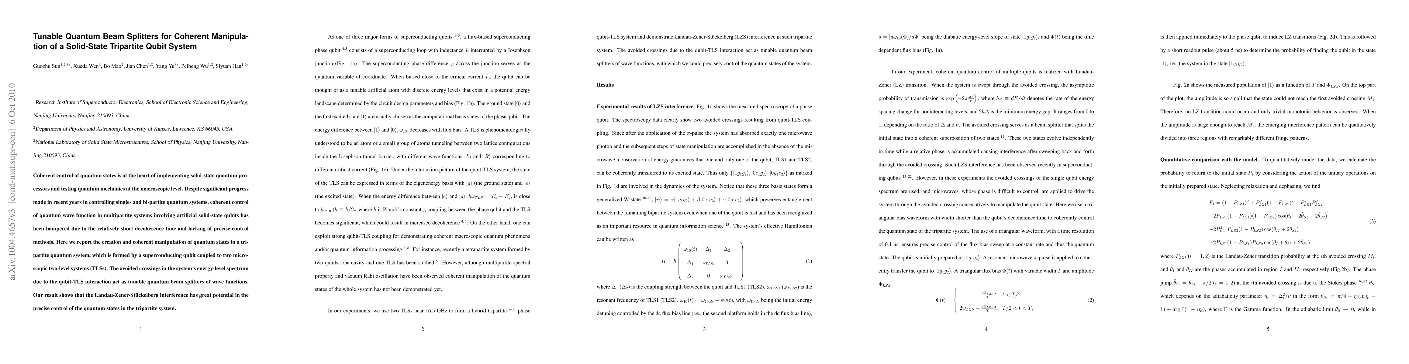 This paper reports the creation and coherent manipulation of quantum states in a solid-state tripartite qubit system using tunable quantum beam splitters formed by avoided crossings in the energy-level spectrum due to qubit-TLS interactions. The study demonstrates the potential of Landau-Zener-Stückelberg interference for precise control of quantum states in multipartite systems.