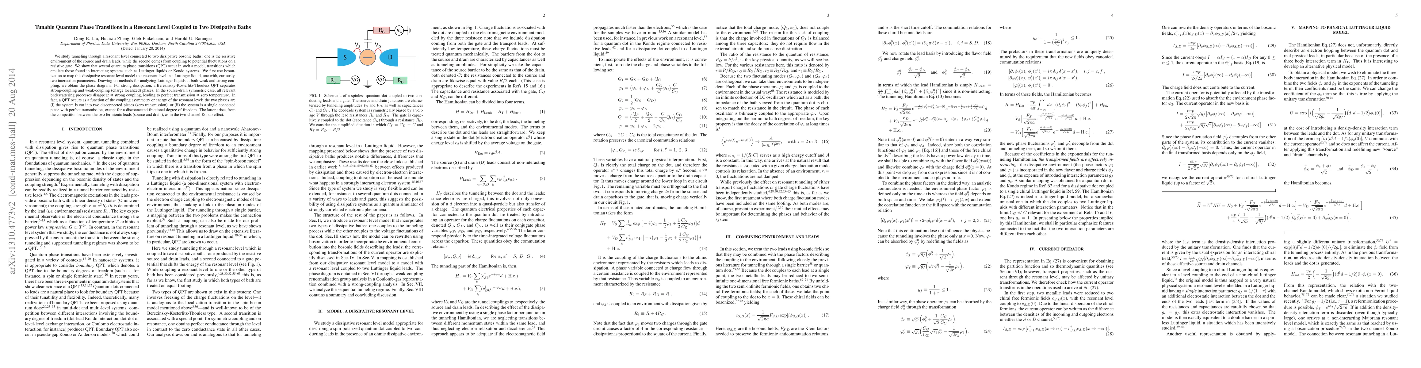 We study tunneling through a resonant level connected to two dissipative bosonic baths: one is the resistive environment of the source and drain leads, while the second comes from coupling to potential fluctuations on a resistive gate. We show that several quantum phase transitions (QPT) occur in such a model, transitions which emulate those found in interacting systems such as Luttinger liquids or Kondo systems. We first use bosonization to map this dissipative resonant level model to a resonant level in a Luttinger liquid, one with, curiously, two interaction parameters. Drawing on methods for analyzing Luttinger liquids at both weak and strong coupling, we obtain the phase diagram. For strong dissipation, a Berezinsky-Kosterlitz-Thouless QPT separates strong-coupling and weak-coupling (charge localized) phases. In the source-drain symmetric case, all relevant backscattering processes disappear at strong coupling, leading to perfect transmission at zero temperature. In fact, a QPT occurs as a function of the coupling asymmetry or energy of the resonant level: the two phases are (i) the system is cut into two disconnected pieces (zero transmission), or (ii) the system is a single connected piece with perfect transmission, except for a disconnected fractional degree of freedom. The latter arises from the competition between the two fermionic leads (source and drain), as in the two-channel Kondo effect.