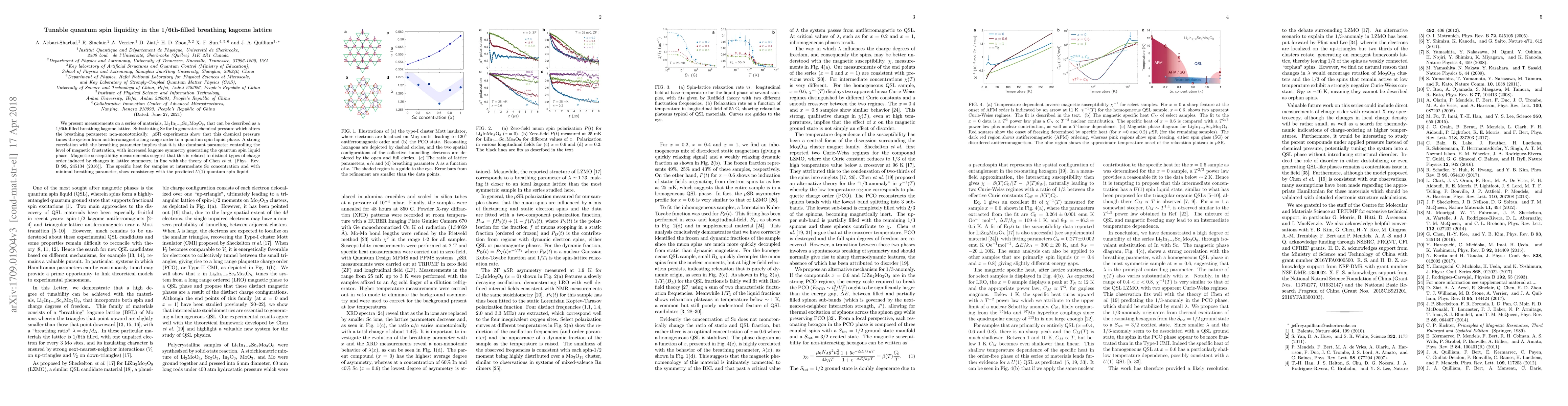 We present measurements on a series of materials, Li$_2$In$_{1-x}$Sc$_x$Mo$_3$O$_8$, that can be described as a 1/6th-filled breathing kagome lattice. Substituting Sc for In generates chemical pressure which alters the breathing parameter non-monotonically. $\mu$SR experiments show that this chemical pressure tunes the system from antiferromagnetic long range order to a quantum spin liquid phase. A strong correlation with the breathing parameter implies that it is the dominant parameter controlling the level of magnetic frustration, with increased kagome symmetry generating the quantum spin liquid phase. Magnetic susceptibility measurements suggest that this is related to distinct types of charge order induced by changes in lattice symmetry, in line with the theory of Chen et al. [Phys. Rev. B 93, 245134 (2016)]. The specific heat for samples at intermediate Sc concentration and with minimal breathing parameter, show consistency with the predicted $U(1)$ quantum spin liquid.