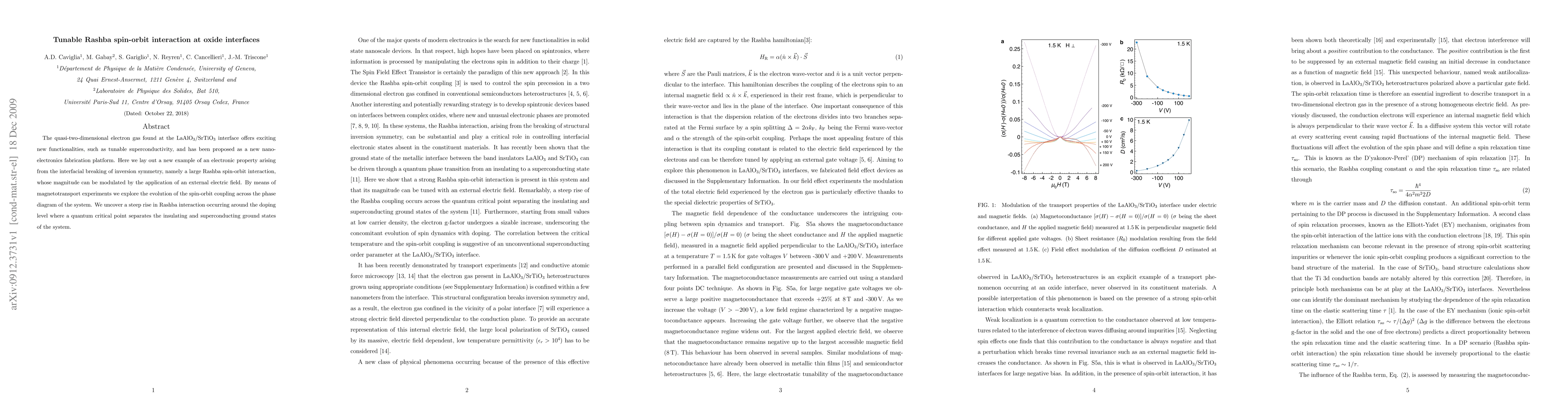 This paper investigates the tunable Rashba spin-orbit interaction at the LaAlO3/SrTiO3 interface, revealing a significant modulation by external electric fields. The study finds a strong increase in Rashba interaction near the quantum critical point between the insulating and superconducting states.