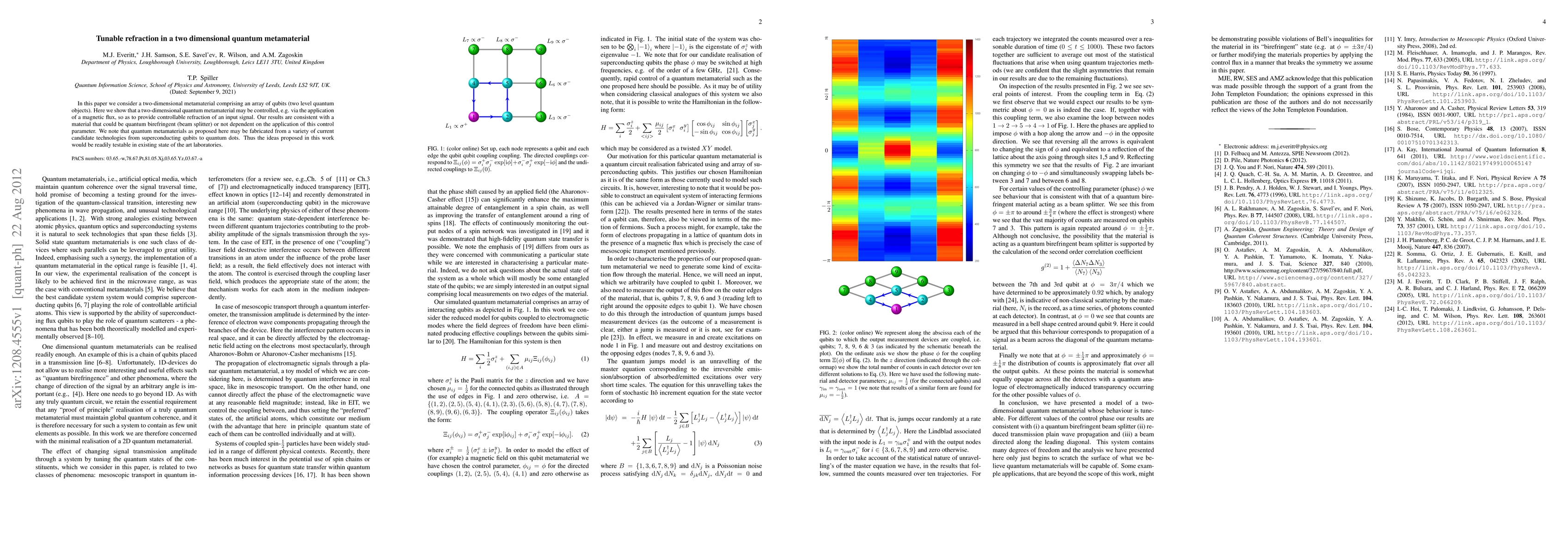 The paper introduces a model for a two-dimensional quantum metamaterial using superconducting qubits, demonstrating its tunable refraction properties via a control parameter φ, and analyzing its behavior as a quantum birefringent beam splitter, plain wave propagator, or material with electromagnetically induced transparency.