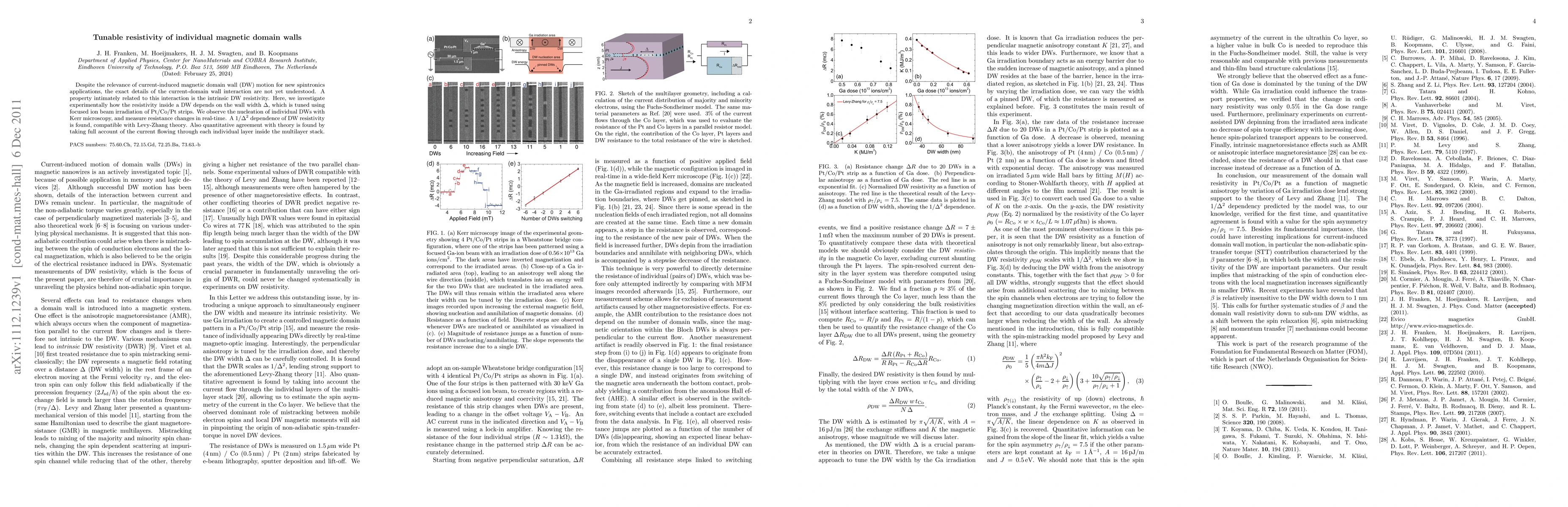 This paper investigates the resistivity of magnetic domain walls (DWs) in Pt/Co/Pt strips, finding a 1/D^2 dependence on DW width D, as predicted by Levy-Zhang theory. The study uses focused ion beam irradiation to tune DW width and measures real-time resistance changes, achieving quantitative agreement with theoretical models.