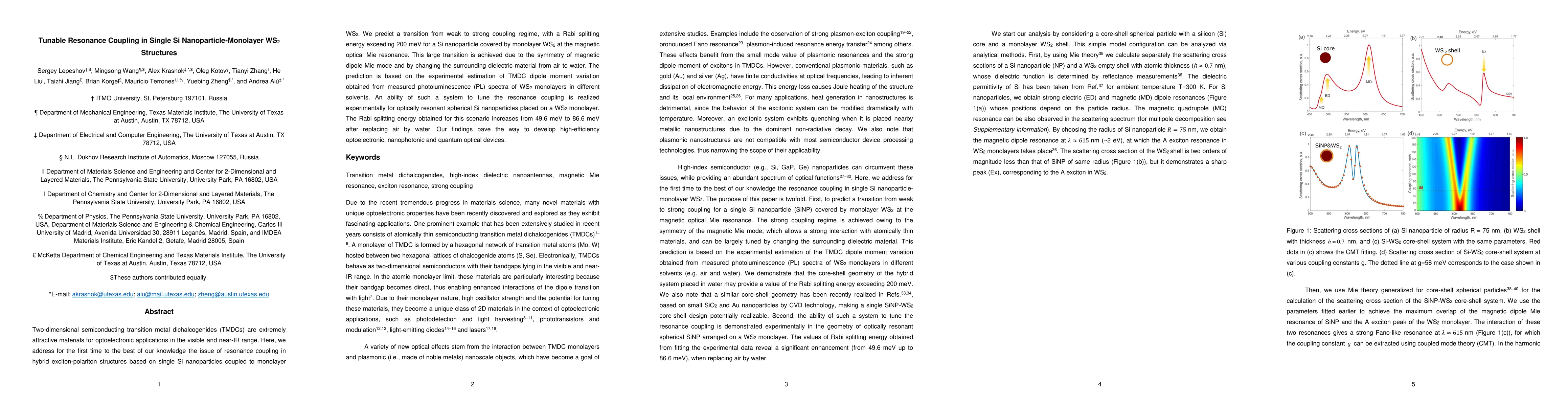 Two-dimensional semiconducting transition metal dichalcogenides (TMDCs) are extremely attractive materials for optoelectronic applications in the visible and near-IR range. Here, we address for the first time to the best of our knowledge the issue of resonance coupling in hybrid exciton-polariton structures based on single Si nanoparticles coupled to monolayer WS2. We predict a transition from weak to strong coupling regime , with a Rabi splitting energy exceeding 200 meV for a Si nanoparticle covered by monolayer WS 2 at the magnetic optical Mie resonance. This large transition is achieved due to the symmetry of magnetic dipole Mie mode and by changing the surrounding dielectric material from air to water. The prediction is based on the experimental estimation of TMDC dipole moment variation obtained from measured photoluminescence (PL) spectra of WS2 monolayers in different solvents. An ability of such a system to tune the resonance coupling is realized experimentally for optically resonant spherical Si nanoparticles placed on a WS2 monolayer. The Rabi splitting energy obtained for this scenario increases from 49.6 meV to 86.6 meV after replacing air by water. Our findings pave the way to develop high-efficiency optoelectronic, nanophotonic and quantum optical devices.