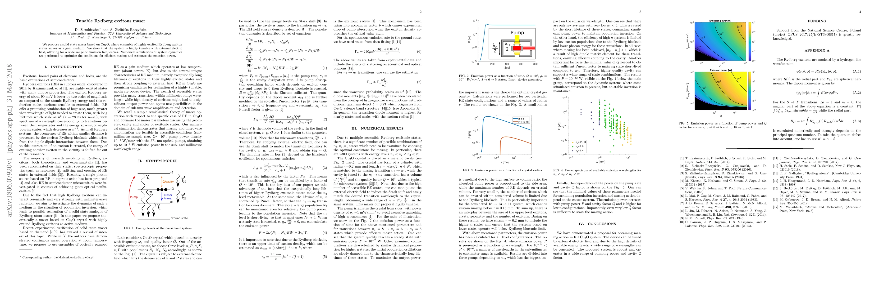 We propose a solid state maser based on Cu2O, where ensemble of highly excited Rydberg exciton states serves as a gain medium. We show that the system is highly tunable with external electric field, allowing for a wide range of emission frequencies. Numerical simulations of system dynamics are performed to optimize the conditions for efficient masing and estimate the emission power.