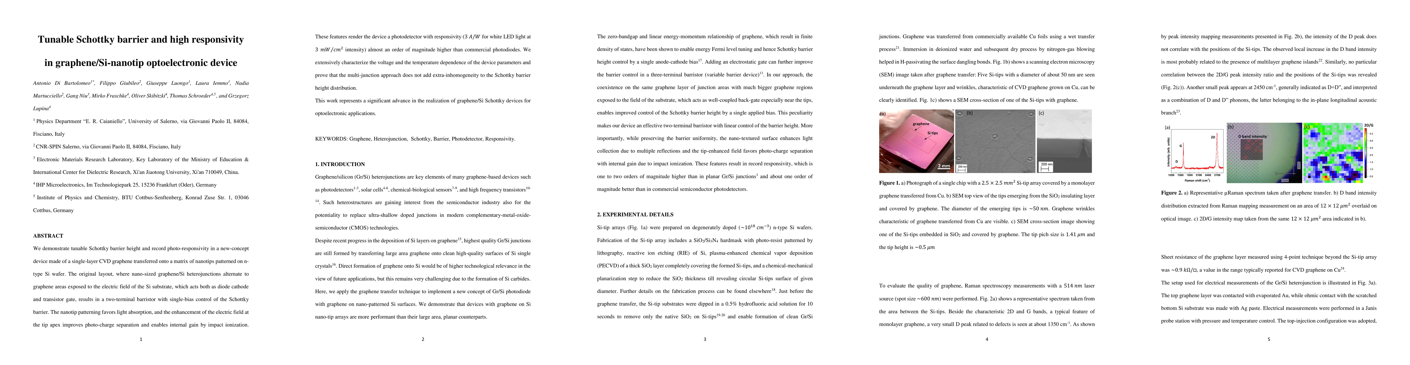 This paper presents a novel graphene/Si-nanotip optoelectronic device with tunable Schottky barrier height and exceptional photo-responsivity, achieving a record responsivity of 3 A/W under white LED light. The device's unique nanotip patterning enhances light absorption and facilitates high-efficiency charge separation and internal gain.