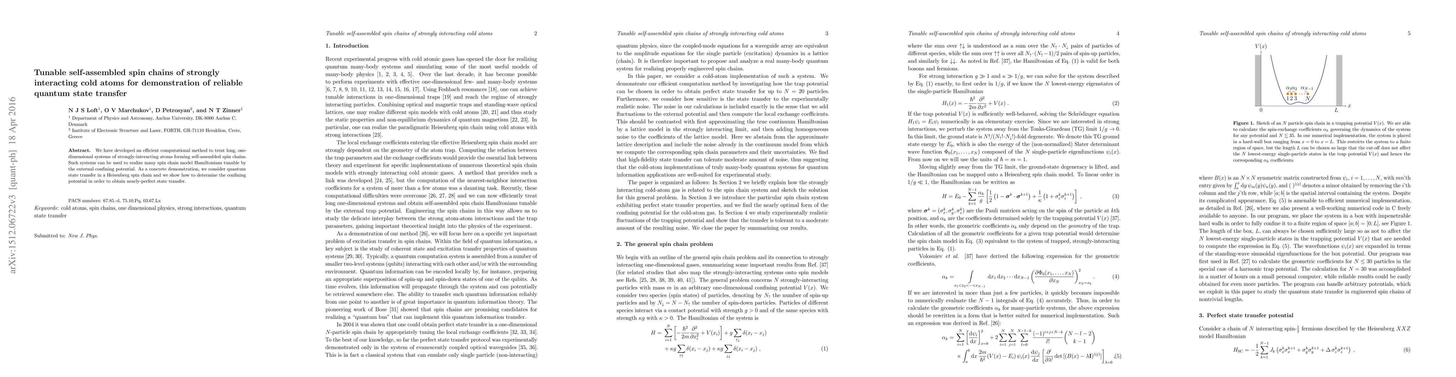 This paper presents a computational method for studying strongly-interacting cold atoms forming self-assembled spin chains, enabling tunable spin chain model Hamiltonians. It demonstrates quantum state transfer in a Heisenberg spin chain and shows how to adjust the external potential for nearly-perfect state transfer.