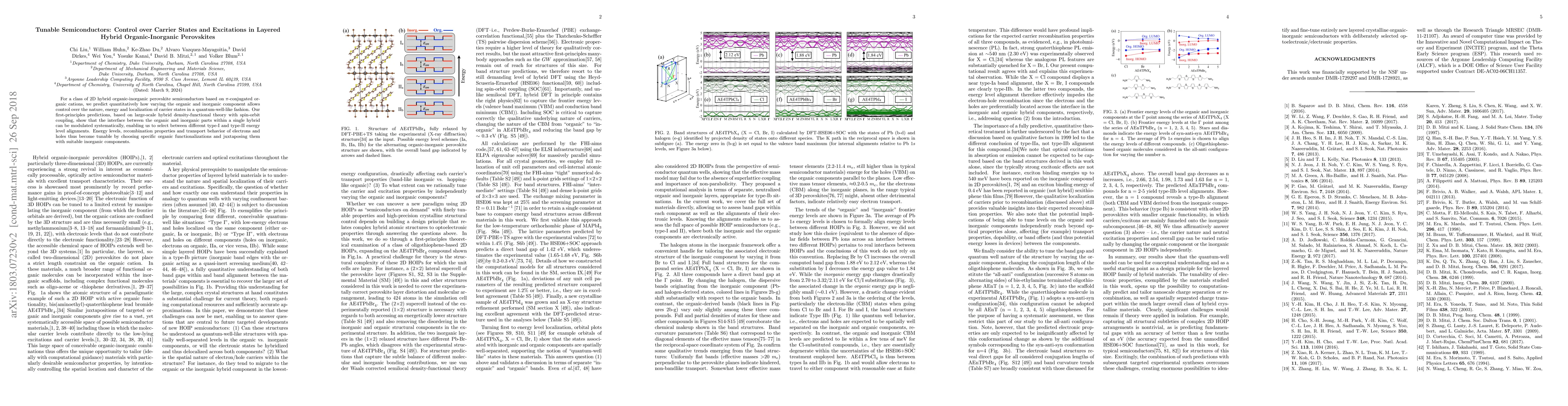 This research paper demonstrates that by varying the organic and inorganic components in 2D hybrid organic-inorganic perovskite semiconductors, one can systematically control the nature, energy, and localization of carrier states. The study uses first-principles calculations to show that different type-I and type-II energy level alignments can be achieved, thereby enabling tunable recombination properties and transport behavior of electrons and holes.