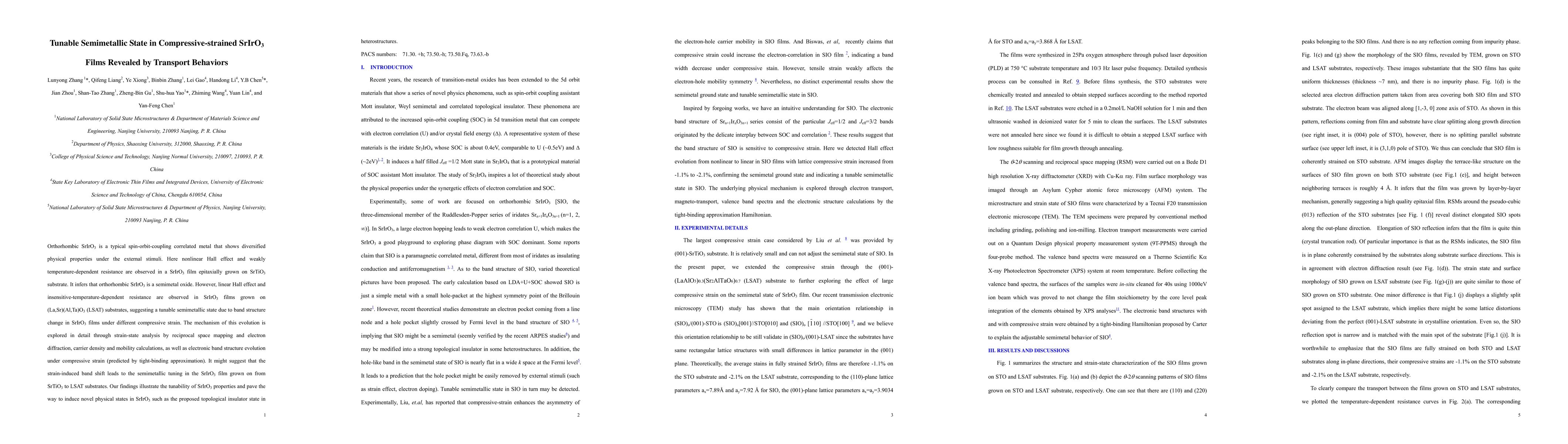 Orthorhombic SrIrO3 is a typical spin-orbit-coupling correlated metal that shows diversified physical properties under the external stimuli. Here nonlinear Hall effect and weakly temperature-dependent resistance are observed in a SrIrO3 film epitaxially grown on SrTiO3 substrate. It infers that orthorhombic SrIrO3 is a semimetal oxide. However, linear Hall effect and insensitive-temperature-dependent resistance are observed in SrIrO3 films grown on (La,Sr)(Al,Ta)O3 (LSAT) substrates, suggesting a tunable semimetallic state due to band structure change in SrIrO3 films under different compressive strain. The mechanism of this evolution is explored in detail through strain-state analysis by reciprocal space mapping and electron diffraction, carrier density and mobility calculations, as well as electronic band structure evolution under compressive strain (predicted by tight-binding approximation). It might suggest that the strain-induced band shift leads to the semimetallic tuning in the SrIrO3 film grown on from SrTiO3 to LSAT substrates. Our findings illustrate the tunability of SrIrO3 properties and pave the way to induce novel physical states in SrIrO3 such as the proposed topological insulator state in heterostructures.