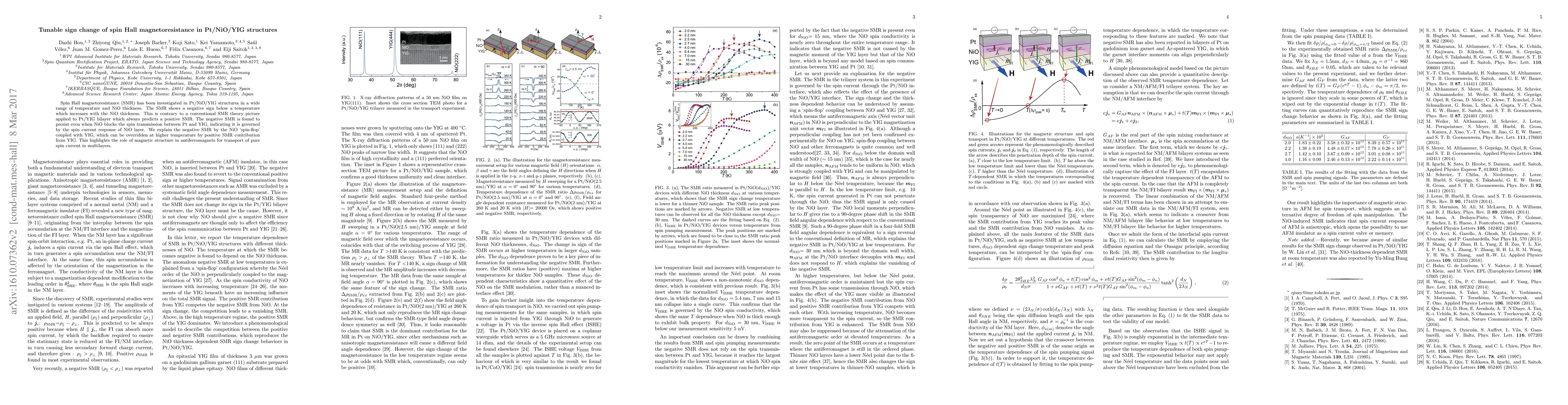 This paper investigates Pt/NiO/YIG structures and reveals a tunable sign change in spin Hall magnetoresistance (SMR) that opposes conventional predictions, showing negative SMR below a temperature dependent on NiO thickness. The negative SMR persists even when NiO blocks spin transmission, indicating its origin in the NiO layer's spin current response.