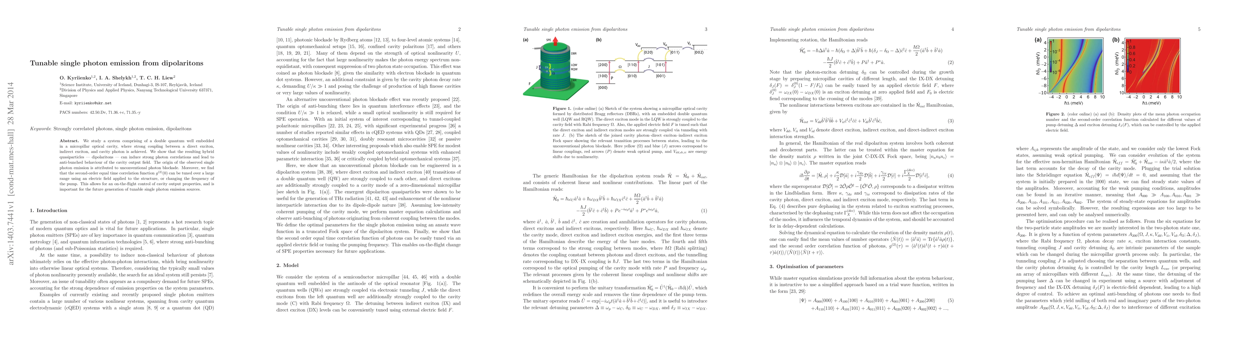 This research investigates a double quantum well in a micropillar cavity achieving strong coupling between excitons and photons, resulting in tunable single photon emission via dipolaritons. The study demonstrates anti-bunched photon correlations and tunable second-order correlation function $g^{(2)}(0)$ through electric field or pump frequency adjustments, crucial for developing tunable single photon sources.