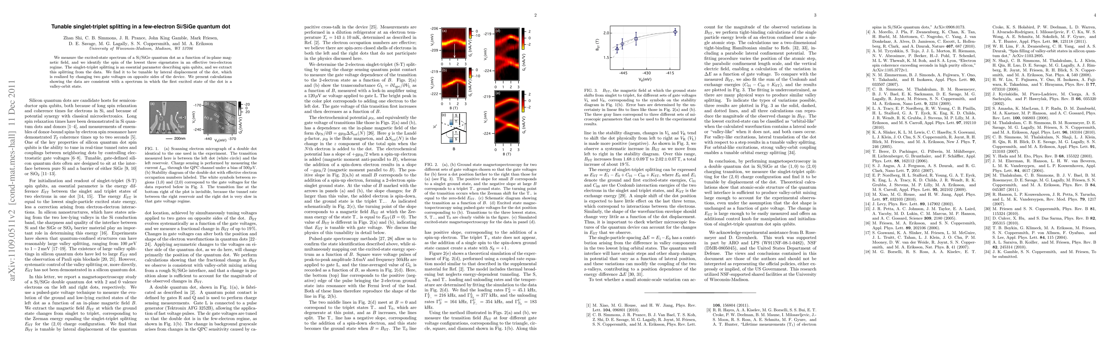 This paper measures the excited-state spectrum of a Si/SiGe quantum dot under magnetic fields, identifying the spin of the lowest three eigenstates. The tunable singlet-triplet splitting, crucial for spin qubits, is shown to be adjustable via lateral displacement controlled by gate voltages, with calculations supporting a valley-orbit state for the first excited state.
