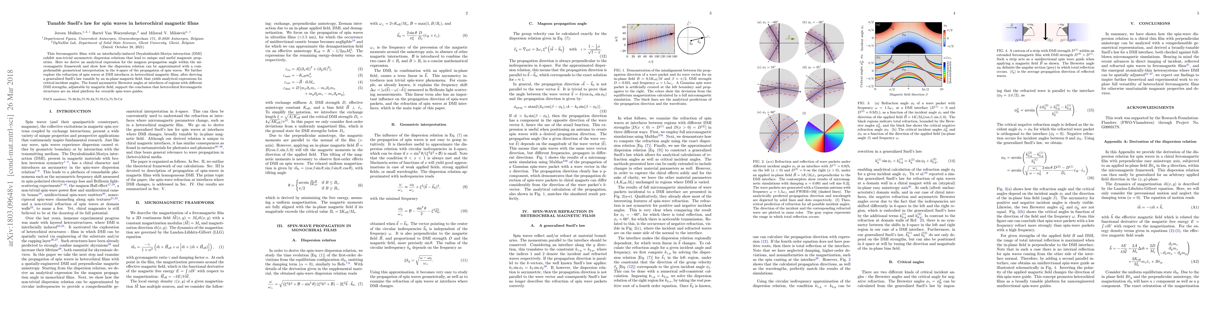 Thin ferromagnetic films with an interfacially induced DMI exhibit nontrivial asymmetric dispersion relations that lead to unique and useful magnonic properties. Here we derive an analytical expression for the magnon propagation angle within the micromagnetic framework and show how the dispersion relation can be approximated with a comprehensible geometrical interpretation in the k-space of the propagation of spin waves. We further explore the refraction of spin waves at DMI interfaces in heterochiral magnetic films, after deriving a generalized Snell's law tunable by an in-plane magnetic field, that yields analytical expressions for critical incident angles. The found asymmetric Brewster angles at interfaces of regions with different DMI strengths, adjustable by magnetic field, support the conclusion that heterochiral ferromagnetic structures are an ideal platform for versatile spin-wave guides.