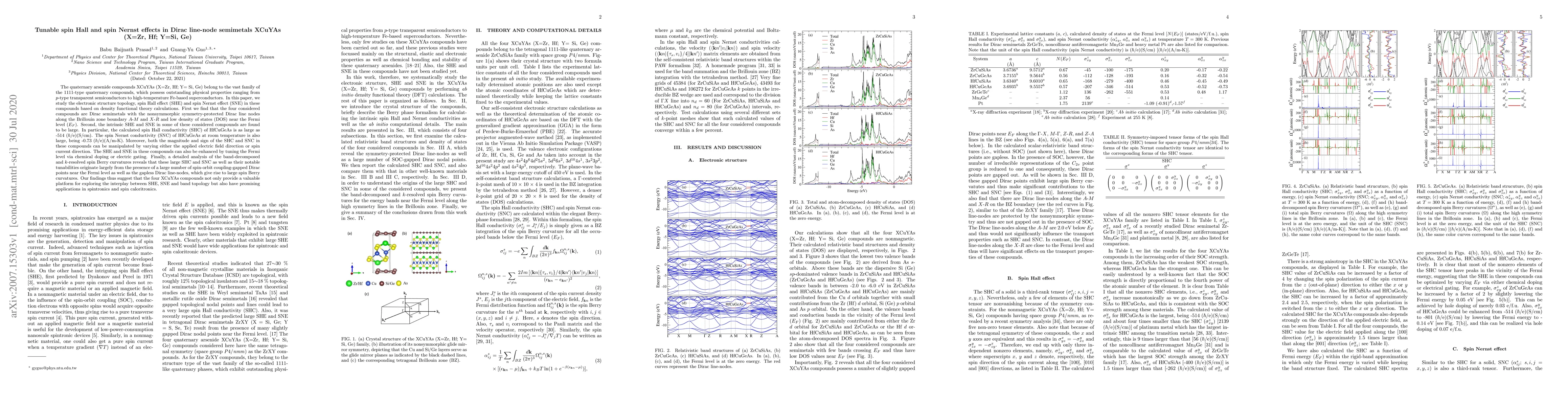 The quaternary arsenide compounds XCuYAs (X=Zr, Hf; Y= Si, Ge) belong to the vast family of the 1111-type quaternary compounds, which possess outstanding physical properties ranging from $p$-type transparent semiconductors to high-temperature Fe-based superconductors. In this paper, we study the electronic structure topology, spin Hall effect (SHE) and spin Nernst effect (SNE) in these compounds based on density functional theory calculations. First we find that the four considered compounds are Dirac semimetals with the nonsymmorphic symmetry-protected Dirac line nodes along the Brillouin zone boundary $A$-$M$ and $X$-$R$ and low density of states (DOS) near the Fermi level ($E_F$). Second, the intrinsic SHE and SNE in some of these considered compounds are found to be large. In particular, the calculated spin Hall conductivity (SHC) of HfCuGeAs is as large as -514 ($\hbar$/e)(S/cm). The spin Nernst conductivity (SNC) of HfCuGeAs at room temperature is also large, being -0.73 ($\hbar$/e)(A/m-K). Moreover, both the magnitude and sign of the SHC and SNC in these compounds can be manipulated by varying either the applied electric field direction or spin current direction. The SHE and SNE in these compounds can also be enhanced by tuning the Fermi level via chemical doping or electric gating. Finally, a detailed analysis of the band-decomposed and $k$-resolved spin Berry curvatures reveals that these large SHC and SNC as well as their notable tunabilities originate largely from the presence of a large number of spin-orbit coupling-gapped Dirac points near the Fermi level as well as the gapless Dirac line-nodes, which give rise to large spin Berry curvatures. Our findings thus suggest that the four XCuYAs compounds not only provide a valuable platform for exploring the interplay between SHE, SNE and band topology but also have promising applications in spintronics and spin caloritronics.