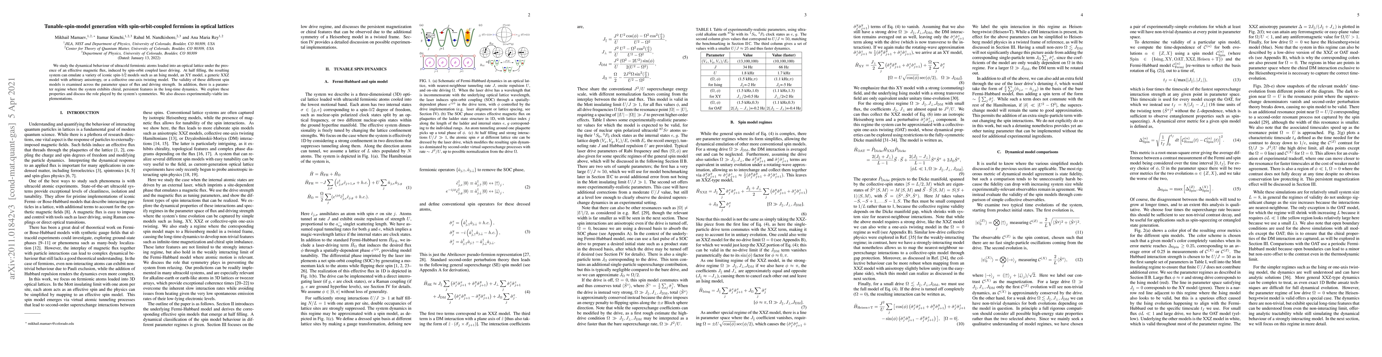 We study the dynamical behaviour of ultracold fermionic atoms loaded into an optical lattice under the presence of an effective magnetic flux, induced by spin-orbit coupled laser driving. At half filling, the resulting system can emulate a variety of iconic spin-1/2 models such as an Ising model, an XY model, a generic XXZ model with arbitrary anisotropy, or a collective one-axis twisting model. The validity of these different spin models is examined across the parameter space of flux and driving strength. In addition, there is a parameter regime where the system exhibits chiral, persistent features in the long-time dynamics. We explore these properties and discuss the role played by the system's symmetries. We also discuss experimentally-viable implementations.