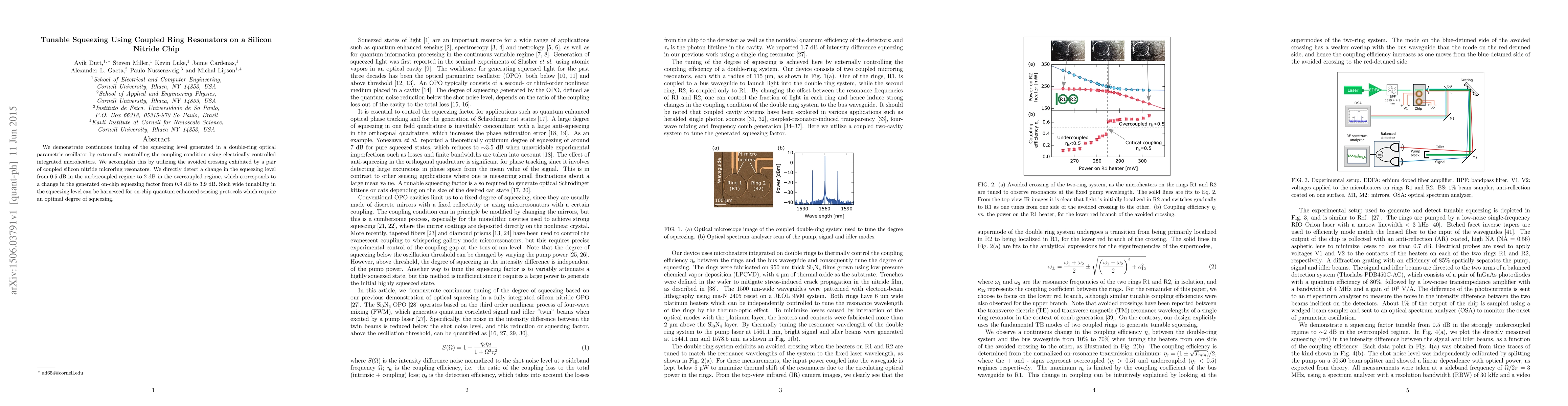 We demonstrate continuous tuning of the squeezing level generated in a double-ring optical parametric oscillator by externally controlling the coupling condition using electrically controlled integrated microheaters. We accomplish this by utilizing the avoided crossing exhibited by a pair of coupled silicon nitride microring resonators. We directly detect a change in the squeezing level from 0.5 dB in the undercoupled regime to 2 dB in the overcoupled regime, which corresponds to a change in the generated on-chip squeezing factor from 0.9 dB to 3.9 dB. Such wide tunability in the squeezing level can be harnessed for on-chip quantum enhanced sensing protocols which require an optimal degree of squeezing.