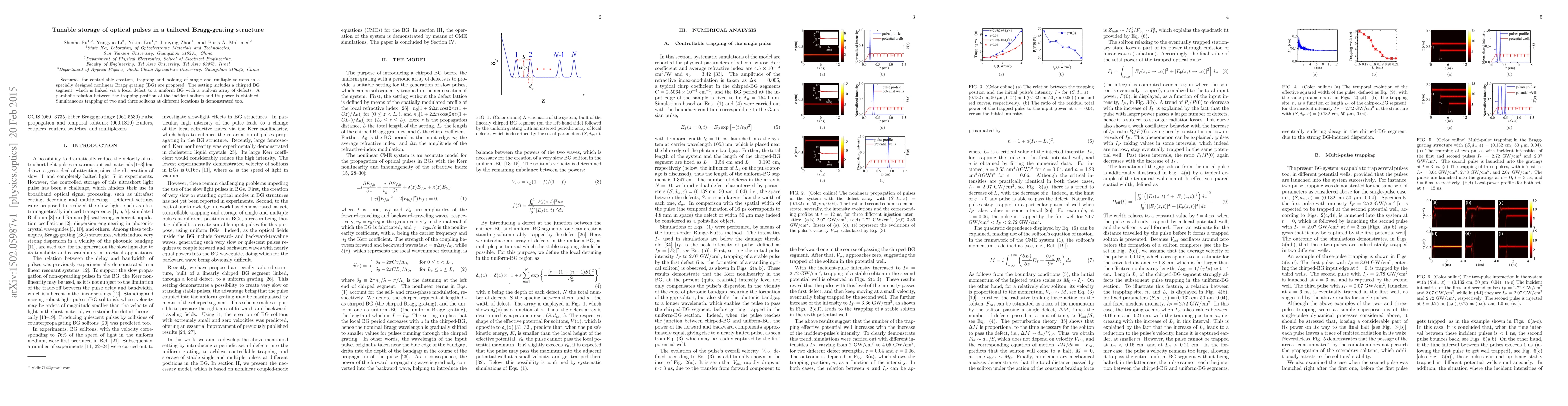 This paper proposes a method for tunable storage of optical pulses using a tailored nonlinear Bragg grating structure, demonstrating controllable trapping of single, double, and triple solitons with a parabolic relationship between soliton power and trapping position.