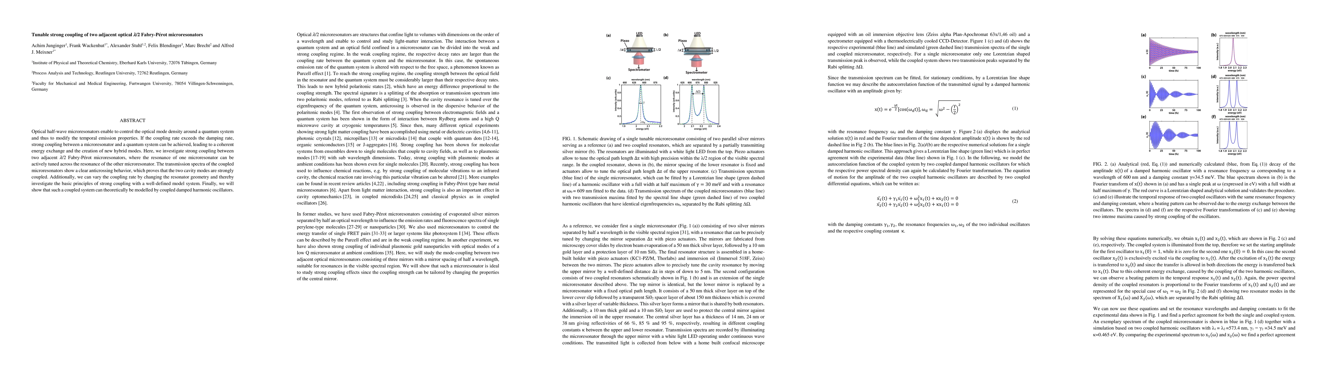 This paper investigates strong coupling between two adjacent λ/2 Fabry-Pérot microresonators, demonstrating tunable coupling and anticrossing behavior in their transmission spectra, and modeling the system as coupled damped harmonic oscillators.