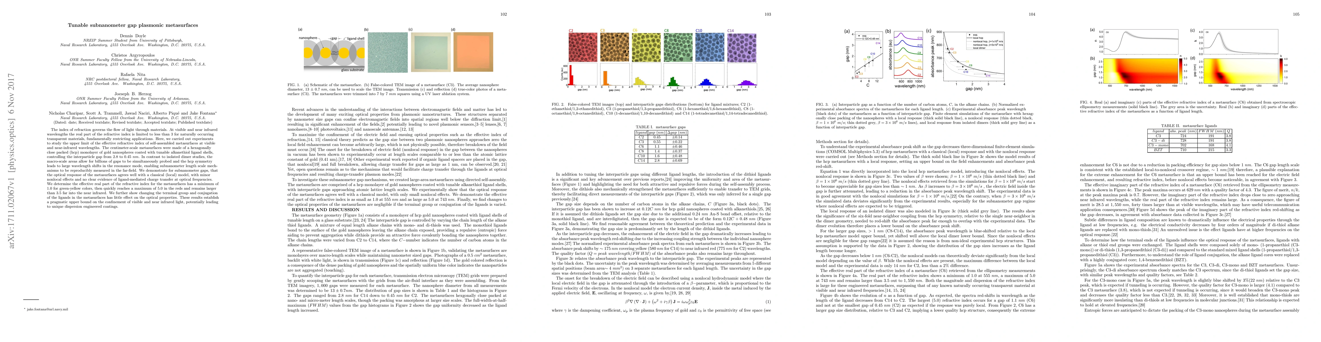 The index of refraction governs the flow of light through materials. At visible and near infrared wavelengths the real part of the refractive index is limited to less than 3 for naturally occurring transparent materials, fundamentally restricting applications. Here, we carried out experiments to study the upper limit of the effective refractive index of self-assembled metasurfaces at visible and near-infrared wavelengths. The centimeter-scale metasurfaces were made of a hexagonally close packed (hcp) monolayer of gold nanospheres coated with tunable alkanethiol ligand shells, controlling the interparticle gap from 2.8 to 0.45 nm. In contrast to isolated dimer studies, the macro-scale areas allow for billions of gaps to be simultaneously probed and the hcp symmetry leads to large wavelength shifts in the resonance mode, enabling subnanometer length scale mechanisms to be reproducibly measured in the far-field. We demonstrate for subnanometer gaps, that the optical response of the metasurfaces agrees well with a classical (local) model, with minor nonlocal effects and no clear evidence of ligand-mediated charge transfer at optical frequencies. We determine the effective real part of the refractive index for the metasurfaces has a minimum of 1.0 for green-yellow colors, then quickly reaches a maximum of 5.0 in the reds and remains larger than 3.5 far into the near infrared. We further show changing the terminal group and conjugation of the ligands in the metasurfaces has little effect on the optical properties. These results establish a pragmatic upper bound on the confinement of visible and near infrared light, potentially leading to unique dispersion engineered coatings