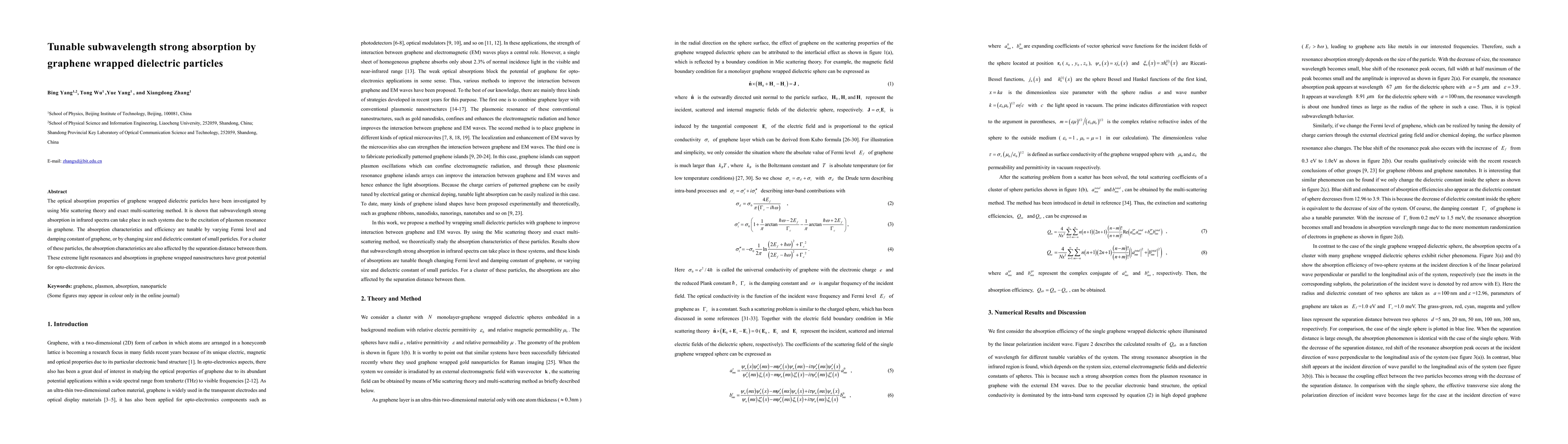 The study investigates tunable subwavelength strong absorption in graphene-wrapped dielectric particles, revealing that plasmon resonance in graphene can lead to significant infrared absorption. The absorption efficiency can be controlled by adjusting the Fermi level and damping constant of graphene, or by altering particle size and dielectric constant, with separation distance influencing clusters of particles. These findings suggest potential applications in opto-electronic devices.