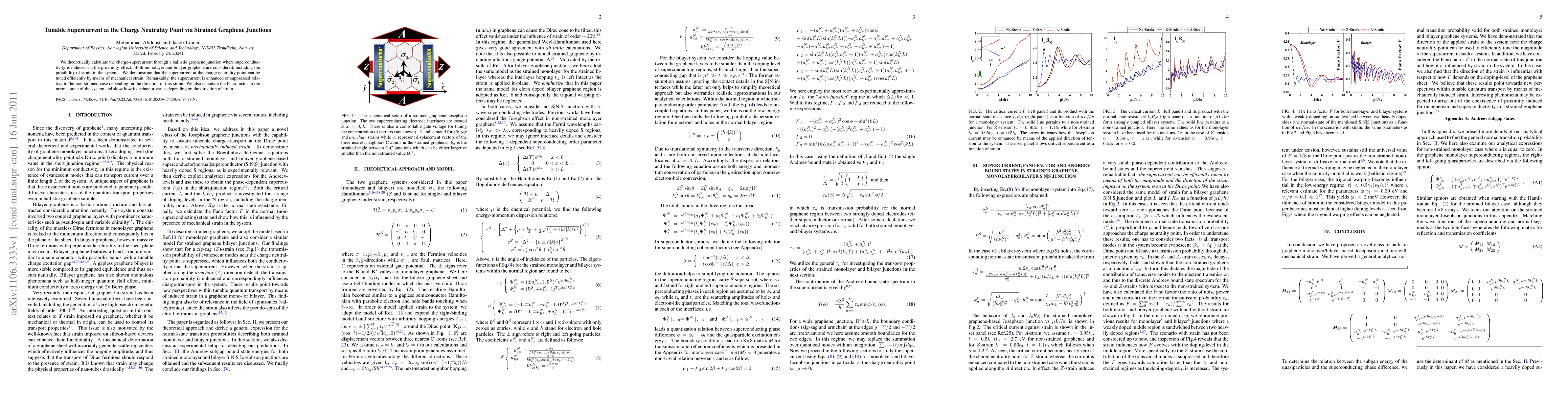 This paper theoretically investigates tunable supercurrent through strained graphene junctions, showing that mechanical strain can efficiently adjust the supercurrent at the charge neutrality point, with direction-dependent enhancement or suppression. It also examines the Fano factor's behavior in the normal state, revealing its variation with strain direction.