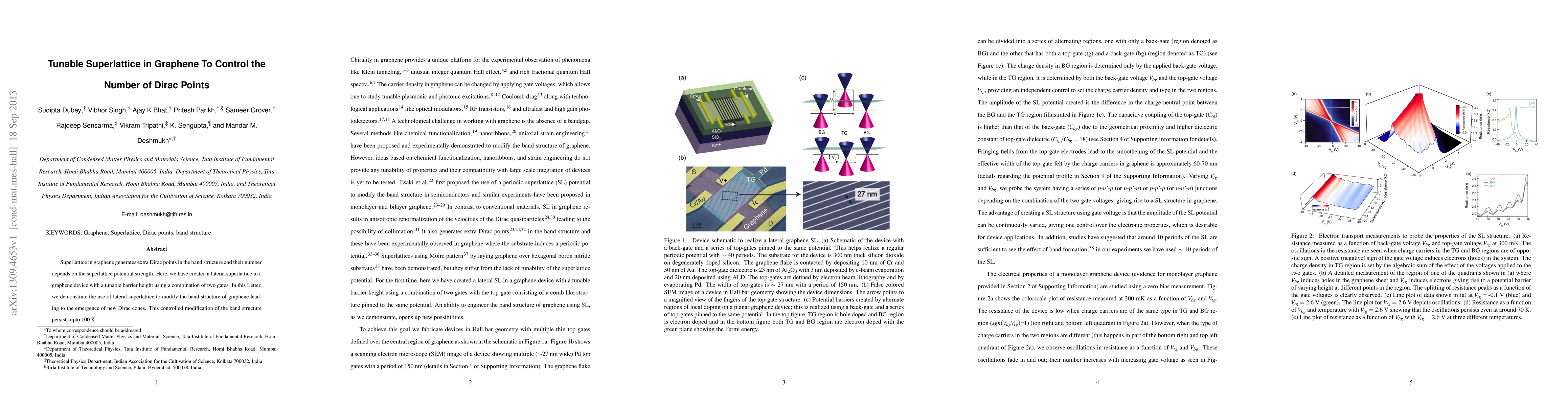 The paper demonstrates a tunable lateral superlattice in graphene that generates additional Dirac points, with their quantity controlled by the superlattice potential strength, achieved through dual-gate barrier height modulation, maintaining its effect up to 100 K.