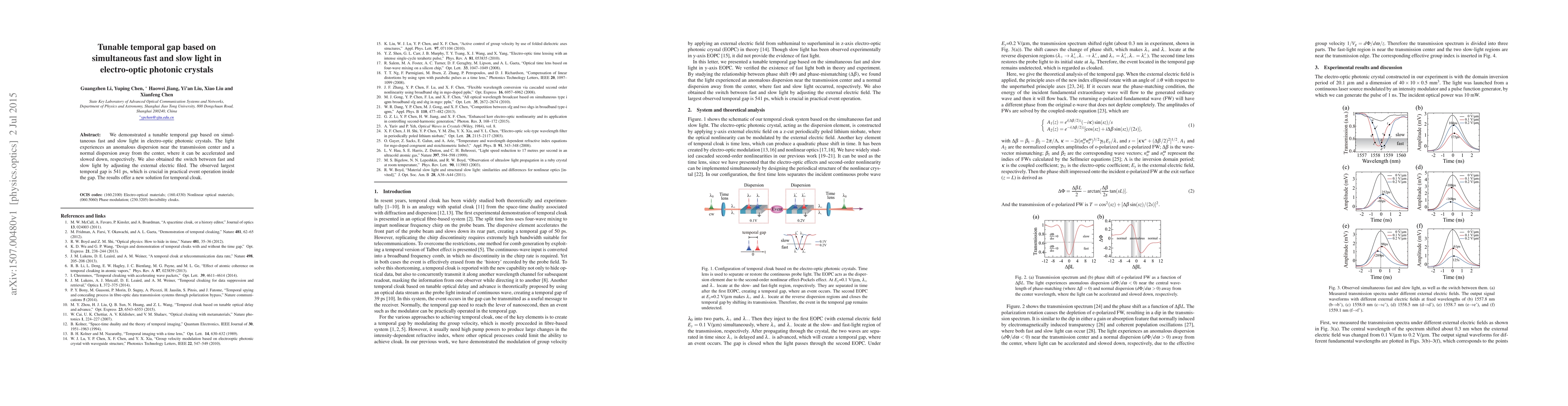 We demonstrated a tunable temporal gap based on simultaneous fast and slow light in electro-optic photonic crystals. The light experiences an anomalous dispersion near the transmission center and a normal dispersion away from the center, where it can be accelerated and slowed down, respectively. We also obtained the switch between fast and slow light by adjusting the external electric filed. The observed largest temporal gap is 541 ps, which is crucial in practical event operation inside the gap. The results offer a new solution for temporal cloak.