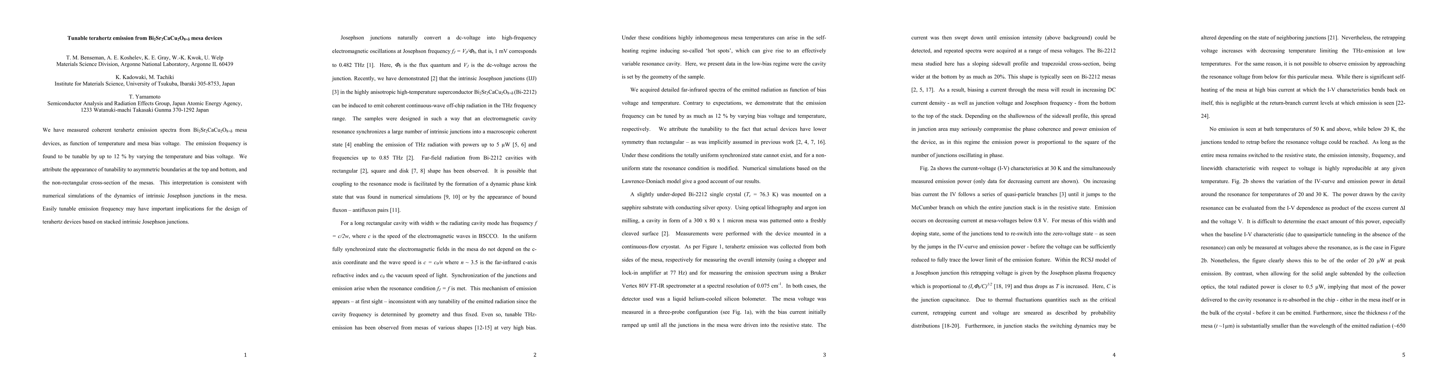 This study investigates tunable terahertz emission from Bi2Sr2CaCu2O8+δ mesa devices, demonstrating a frequency tunability of up to 12% via temperature and bias voltage adjustments. The tunability is attributed to the asymmetric mesa boundaries and non-rectangular cross-section, supported by numerical simulations.