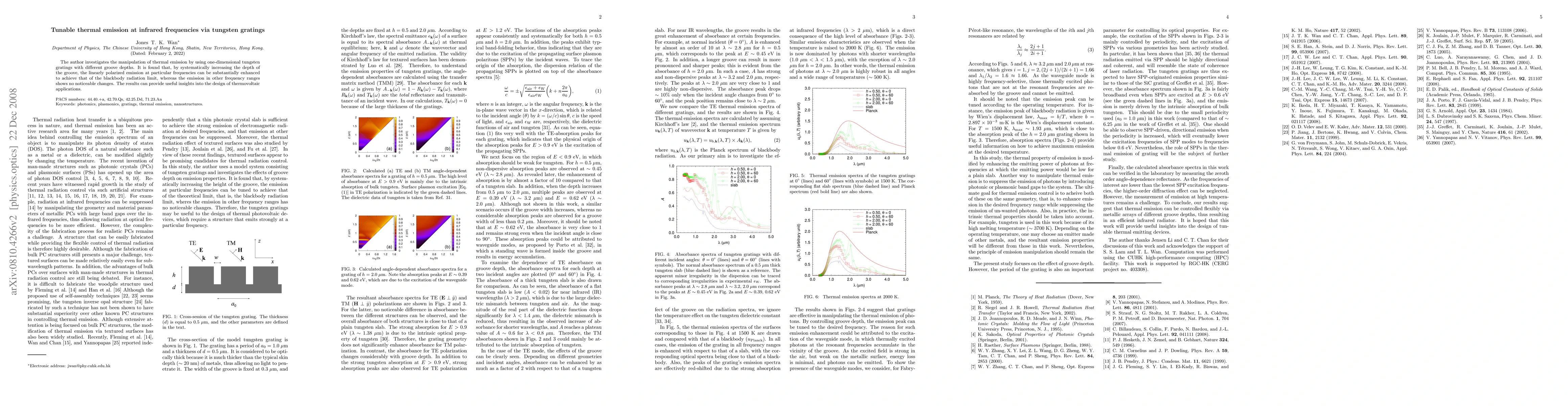 The author investigates the manipulation of thermal emission by using one-dimensional tungsten gratings with different groove depths. It is found that, by systematically increasing the depth of the groove, the linearly polarized emission at particular frequencies can be substantially enhanced to achieve that of the blackbody radiation limit, whereas the emission in other frequency ranges shows no noticeable changes. The results can provide useful insights into the design of thermovoltaic applications.
