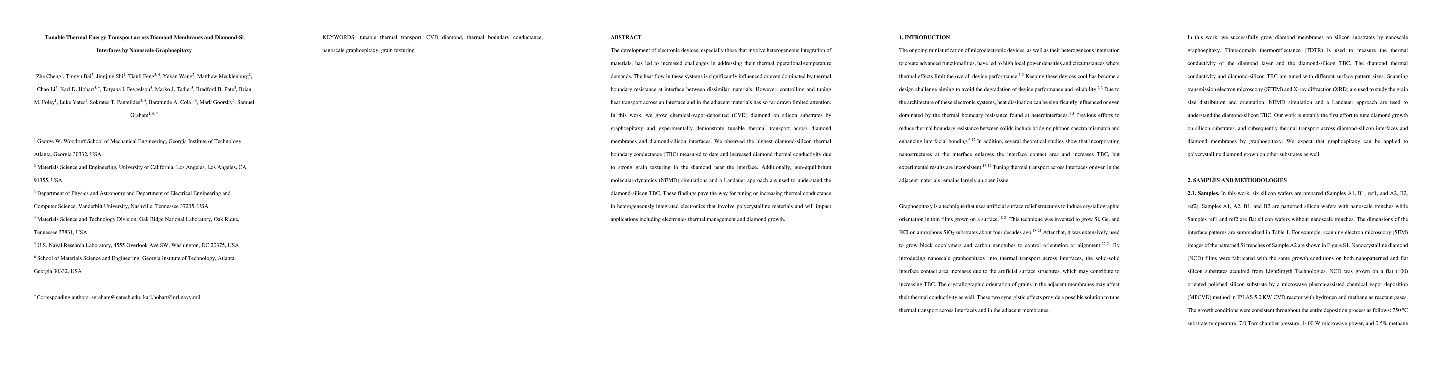 This study demonstrates the tunable thermal transport across diamond membranes and diamond-silicon interfaces achieved through nanoscale graphoepitaxy, showing the highest measured thermal boundary conductance to date and enhanced diamond thermal conductivity due to grain texturing. Simulations and theoretical approaches further elucidate these effects, suggesting significant potential for improving thermal management in integrated electronics.