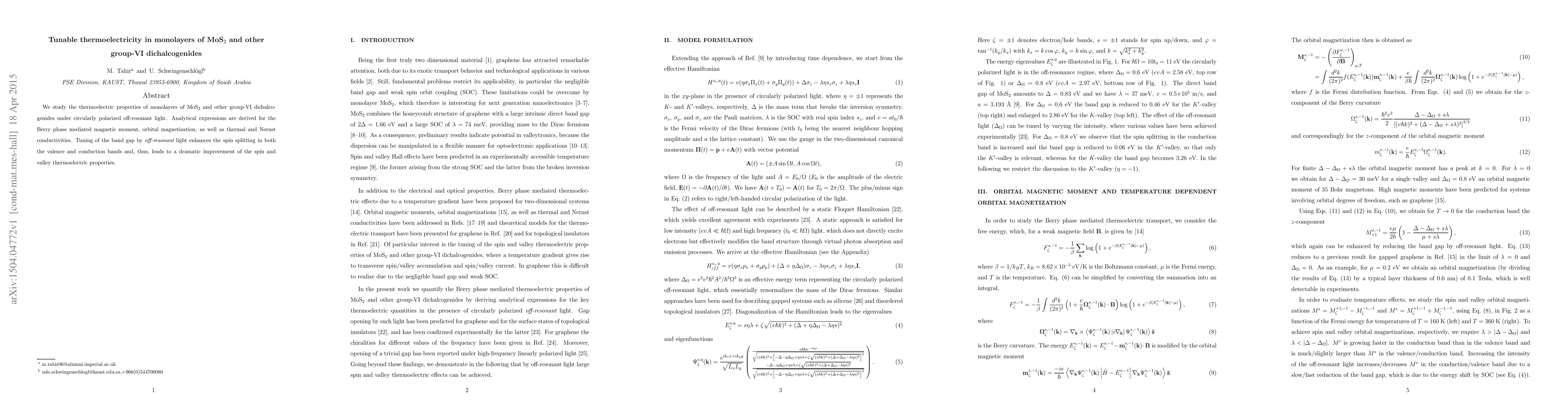 This paper investigates the thermoelectric properties of monolayers of MoS$_{2}$ and other group-VI dichalcogenides, revealing that off-resonant light can tune the band gap and enhance spin splitting, significantly improving spin and valley thermoelectric performance. Analytical expressions are derived for related magnetic and thermal conductivities.
