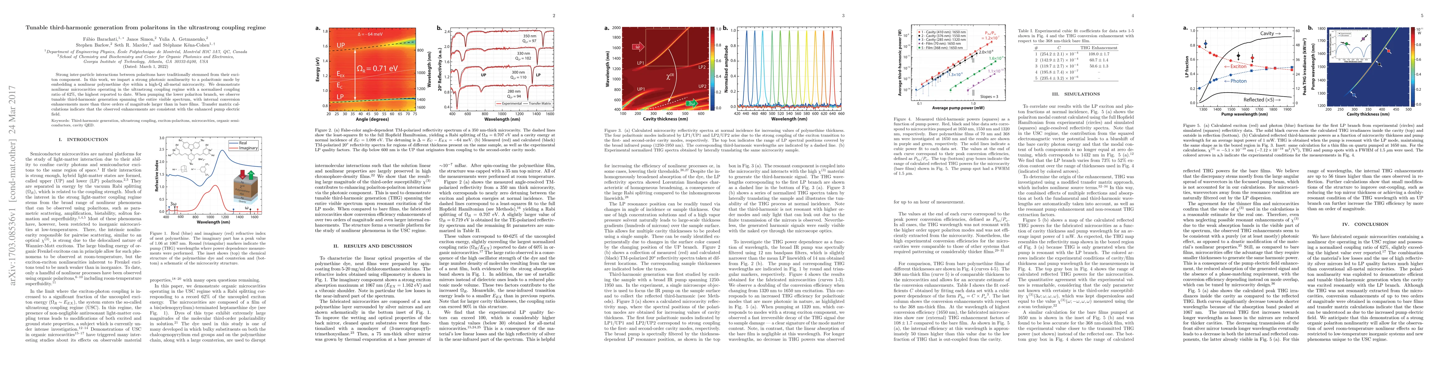This paper demonstrates tunable third-harmonic generation in polaritons embedded in a high-Q all-metal microcavity with a nonlinear polymethine dye, achieving the highest reported ultrastrong coupling ratio of 62%. The study shows significant enhancements in internal conversion, over three orders of magnitude greater than in bare films, enabling visible spectrum tunability.